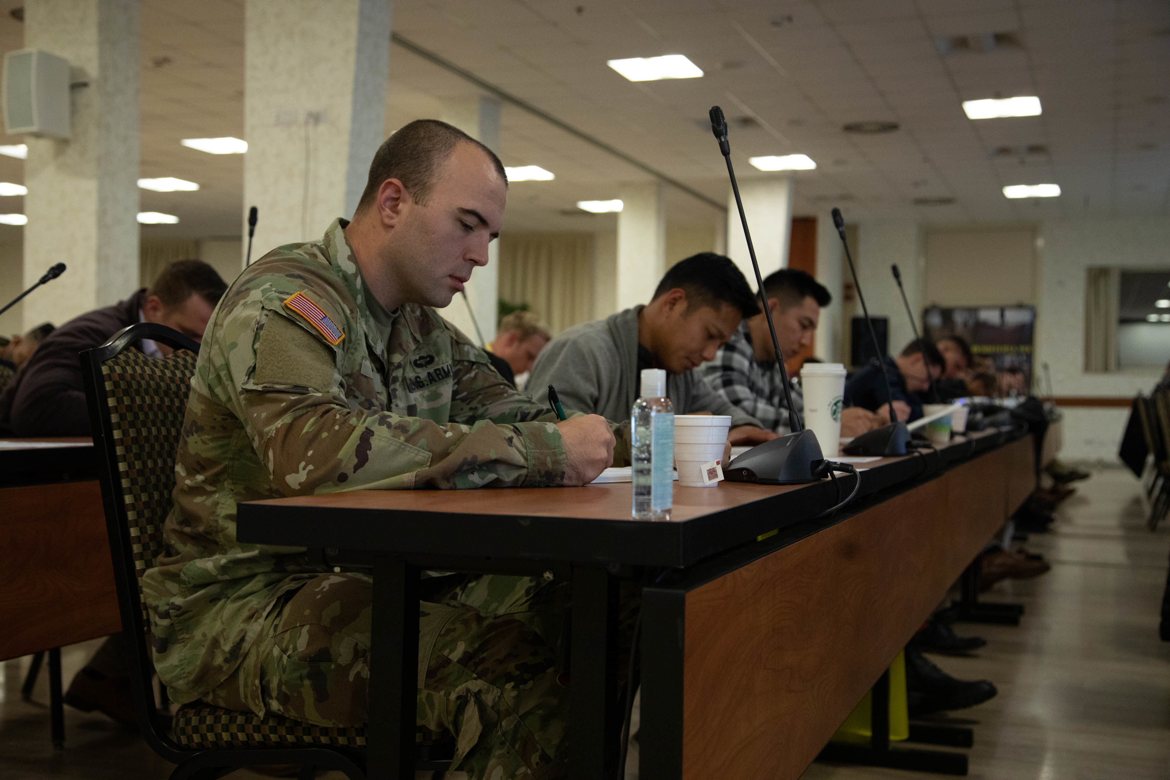Members of U.S. Army Southern European Task Force, Africa attend the SETAF-AF Squad Leader Summit at Caserma Del Din, Vicenza, Italy, Nov. 16, 2021. The summit is a leader development program for junior non-commissioned officers to refine their leadership skills and improve squad readiness. Participants were briefed by on-post agencies and were able to interact gain knowledge of their community resources. (U.S. Army photo by Sgt. Meleesa Gutierrez.)