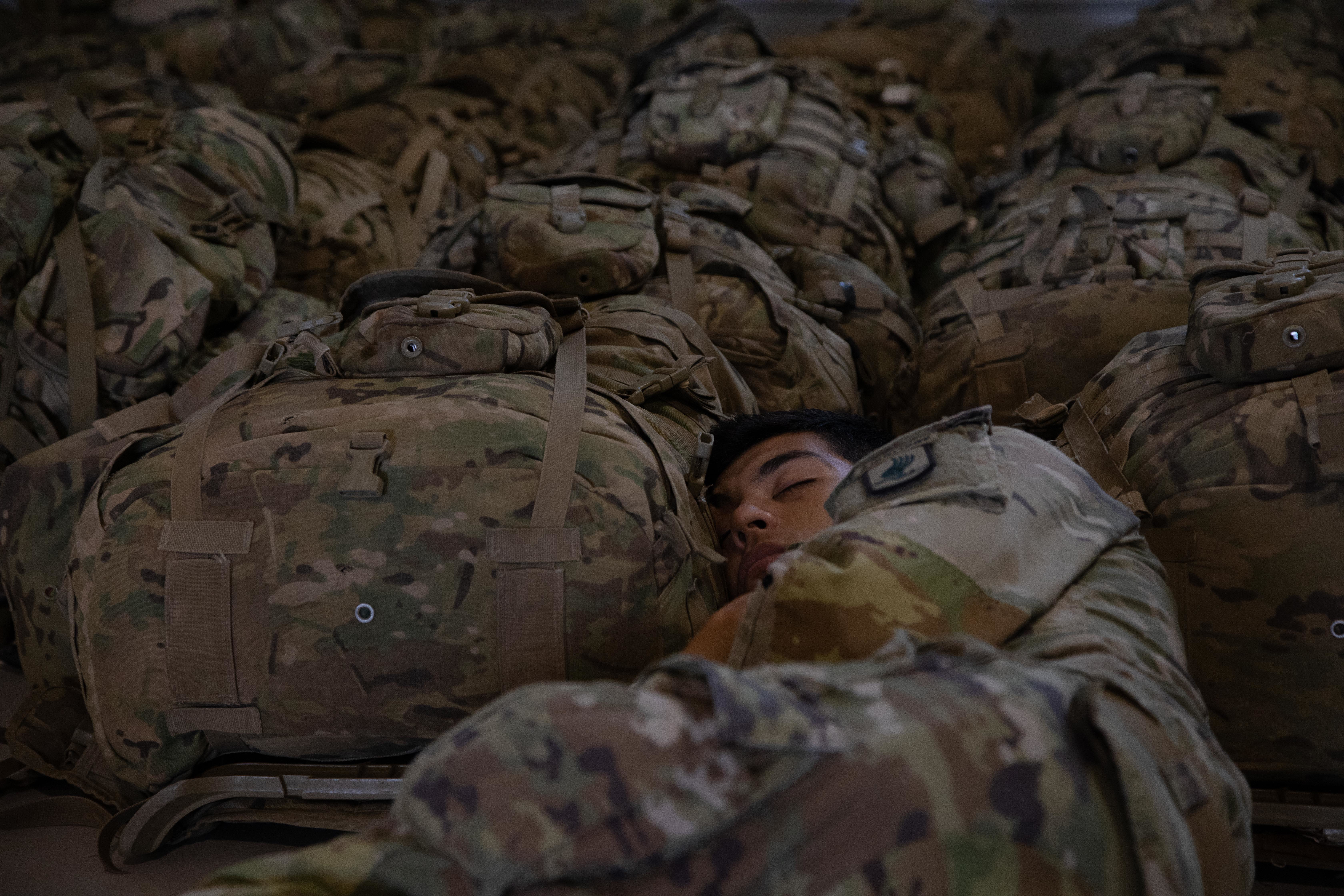 Soldiers from the 173rd Airborne Brigade, 2 Battalion, 503rd Infantry Regiment, 1st Platoon, Alpha Company, get a few minutes of rest during the North Africa Response Force Mission Readiness Exercise Aviano Airbase, Italy. Even under rigorous COVID-19 mitigation measures, the exercise tested the no-notice deployment capability of U.S. Africa Command’s North and West Africa Response Force, made up of elements of the 173rd Airborne Brigade and Southern European Task Force, Africa, from Vicenza, Italy. (U.S. Army photo by Sgt. Meleesa Gutierrez)