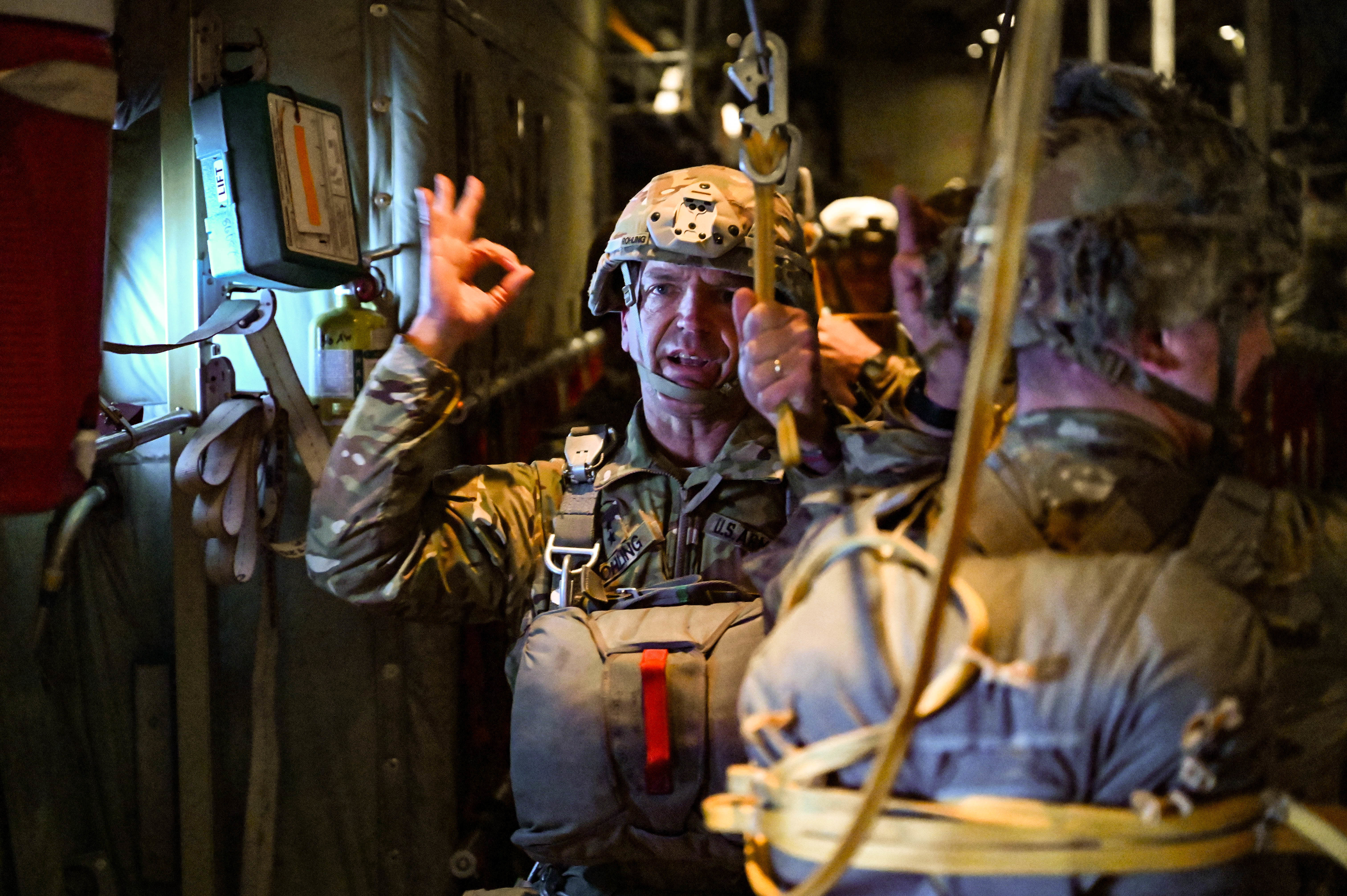Maj. Gen. Andrew Rohling conducts an airborne proficiency jump with 173rd Airborne Brigade Soldiers Dec. 9. 2021, near Aviano Air Base, Italy. Rohling, U.S Army Southern European Task Force - Africa commander, leads the headquarters that provides command and control of North and West Africa Response Force and serves as U.S. Africa Command's joint task force headquarters in support of contingency operations. (U.S. Air Force photo by Tech. Sgt. Michael Cossaboom)