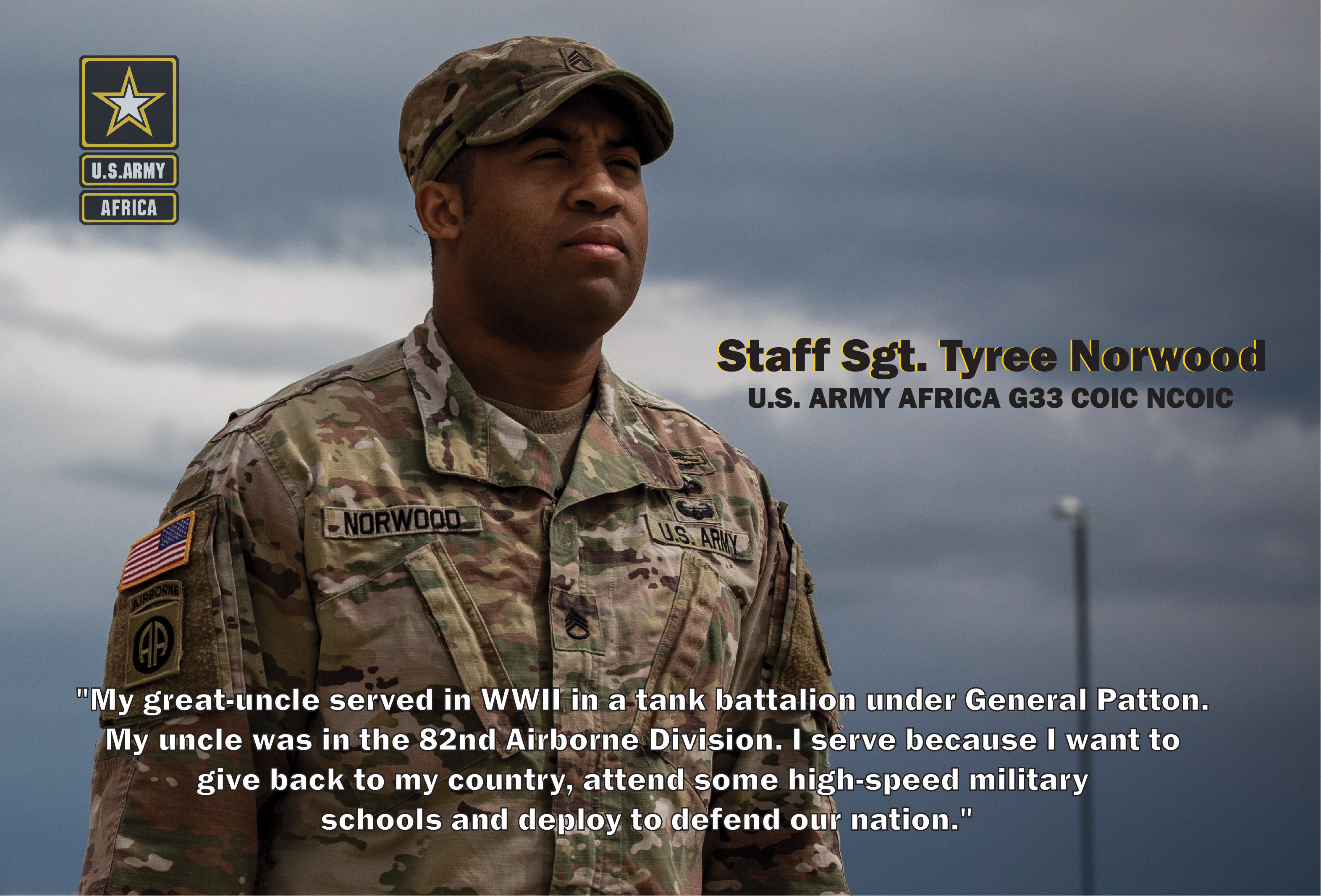 "My great-uncle served in WWII in a tank battalion under General Patton. My uncle was in the 82nd Airborne Division. I serve because I want to give back to my country, attend some high-speed military schools and deploy to defend our nation."