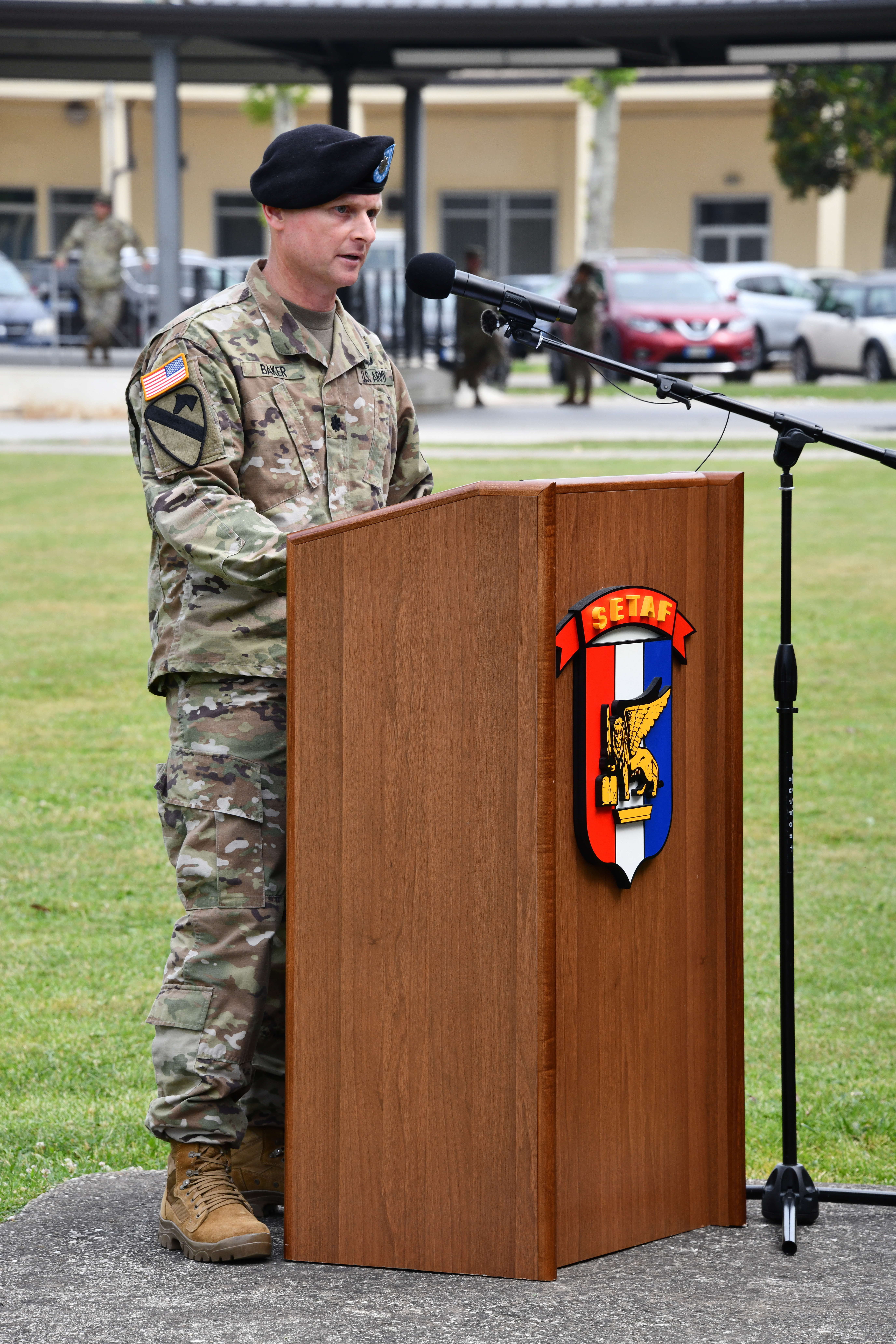 U.S. Army Lt. Col. John M. Baker, incoming battalion commander, Headquarters and Headquarters Battalion, U.S. Army Africa, addresses the audience during the change of command ceremony at Caserma Ederle in Vicenza, Italy, July 01, 2020. (U.S. Army Photos by Paolo Bovo)