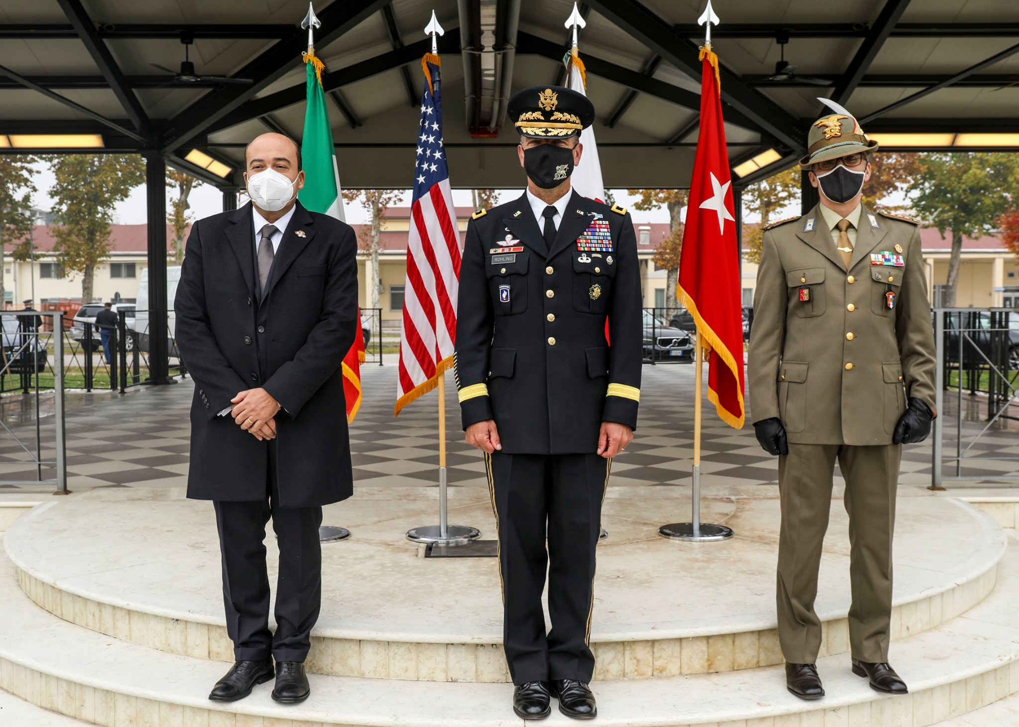 Maj. Gen. Andrew M. Rohling, the U.S. Army Southern European Task Force, Africa commander, center; Pietro Signoriello, the Vicenza prefect, left; and Col. Michele Biasutti, the Senior Italian Officer, participate in the Southern European Task Force 65th anniversary celebration held on Caserma Ederle in Vicenza, Italy, Oct. 22, 2020. In their remarks, both Rohling and Biasutti highlighted the strength and value of the Italian and American communities’ partnership in Northern Italy. SETAF was formally established on Oct. 25, 1955. For more than six decades, Soldiers from SETAF have participated in operations throughout Europe, Asia, and Africa. (U.S. Army photo by Pfc. Semaj Johnson)