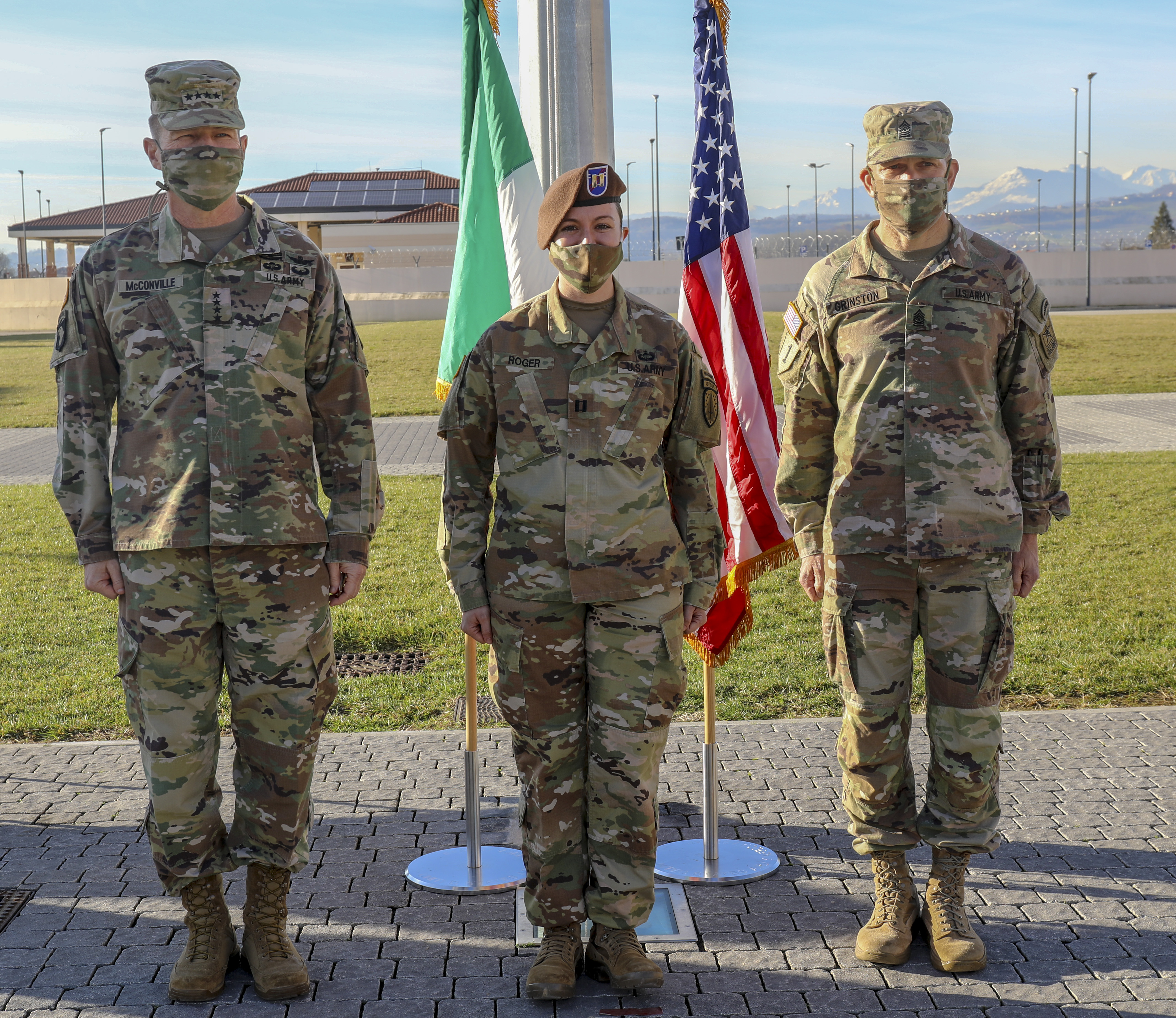 Army Chief of Staff Gen. James C. McConville, left, and Sgt. Maj. of the Army Michael A. Grinston, right, prepare to present an award to Capt. Sara Roger, assigned to the 2nd Security Forces Assistance Brigade, at the U.S. Army Southern European Task Force, Africa headquarters in Vicenza, Italy, Dec. 14. McConville and Grinston visited the SETAF-AF headquarters to meet with SETAF-AF leaders. The CSA and SMA also had lunch with and presented awards to Soldiers. (U.S. Army photo by Spc. Semaj Johnson)