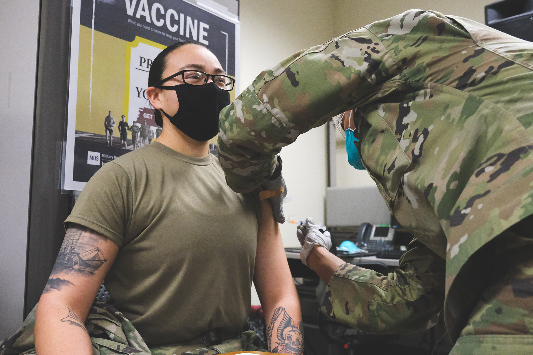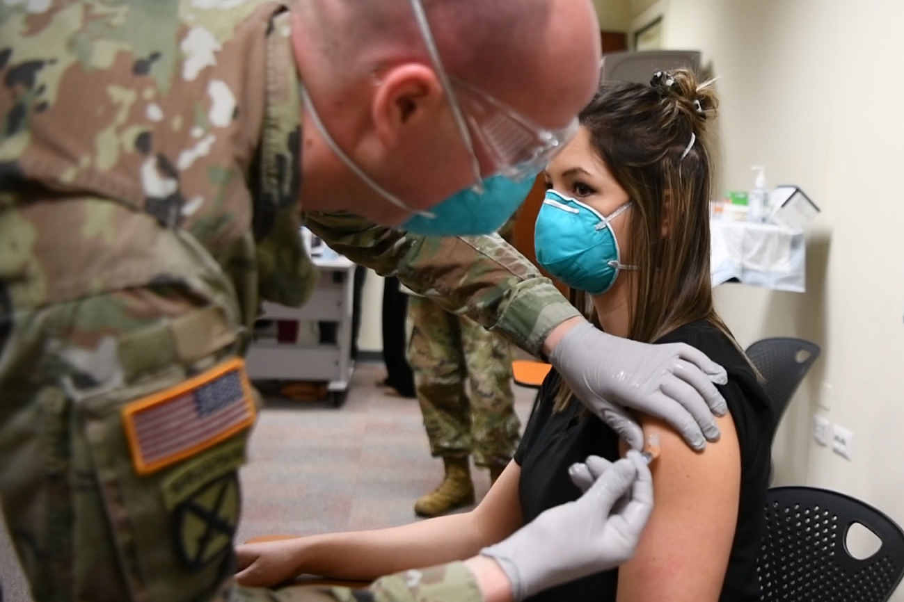 U.S. Army Health Center Vicenza Pharmacy Technician Spc. Siary Williams administers the first active duty COVID-19 vaccine to Pfc. Brooke Sandoval, a combat medic in the primary care January 8, 2021 in Vicenza, Italy. USAHC-V administered the first batch of vaccines to the Vicenza healthcare workers and first responders in the military community. (U.S. Army Garrison Italy photo by Cristina Piosa)