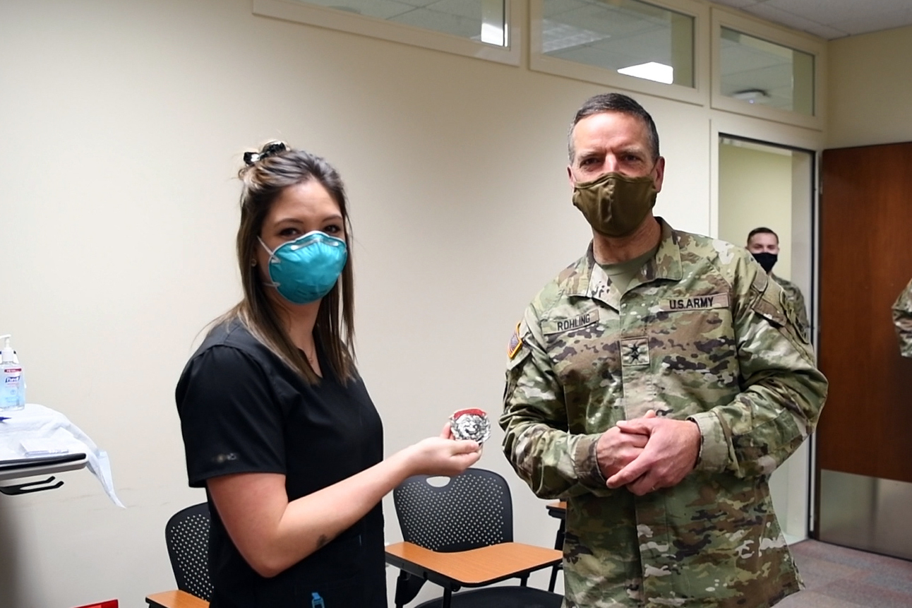 Commander of the U.S. Army Southern European Task Force, Africa Maj. Gen. Andrew Rohling presents Registered Nurse Ashley Reinhold with a SETAF coin in appreciation for being the first member of the U.S. Army Garrison Italy community to receive the COVID-19 vaccine January 8, 2021 in Vicenza, Italy. Initial vaccinations will be limited to healthcare workers and first responders to assess the process and will be used to plan expanded distribution phases. (U.S. Army Garrison Italy photo by Maria Cavins)