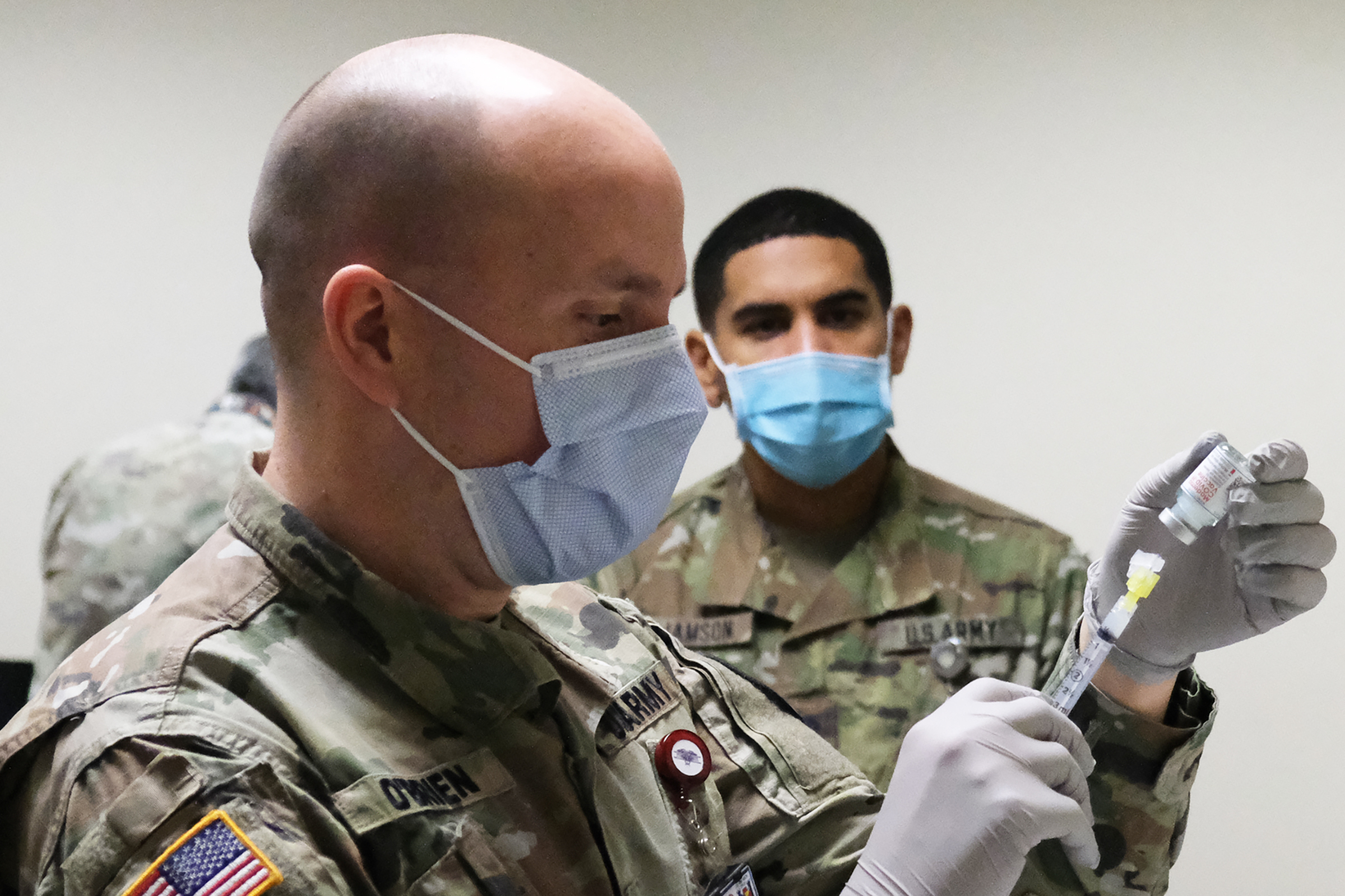U.S. Army Health Center Vicenza Pharmacy Officer in Charge Maj. Sean O'Brien prepares the first USAG Italy COVID-19 vaccine, while U.S. Army Health Center Vicenza Pharmacy Technician Spc. Siary Williams observes January 8, 2021 in Vicenza, Italy. USAHC-V administered the first batch of vaccines to the Vicenza healthcare workers and first responders in the military community. (U.S. Army Garrison Italy photo by Cristina Piosa)