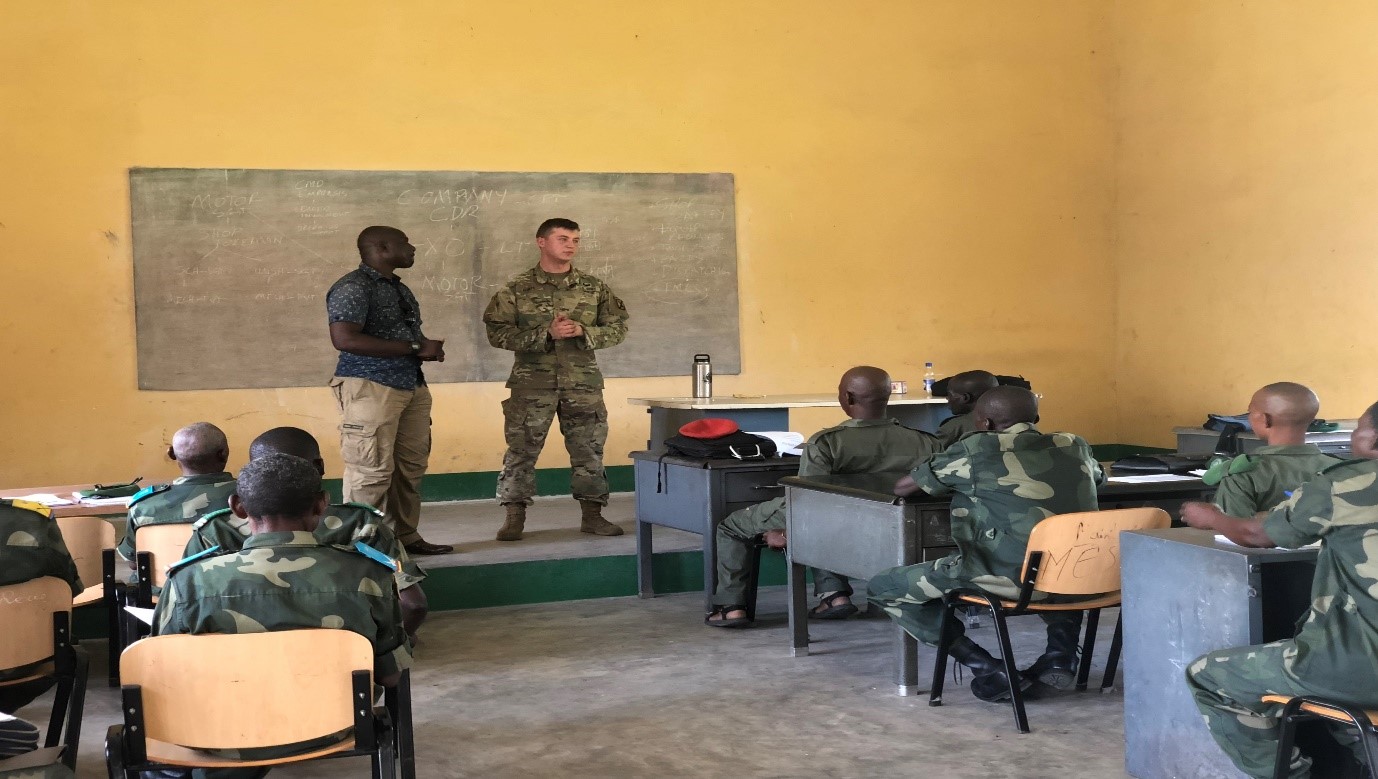 Warrant Officer Stephen Madison and Sgt. First Class Jerry Hitchcock, Soldiers of the 10th Mountain Division Sustainment Brigade, 10th Mountain Division, conducted vehicle maintenance classes during the first week of Logistics School in the Democratic Republic of the Congo, May 7-11, 2018.