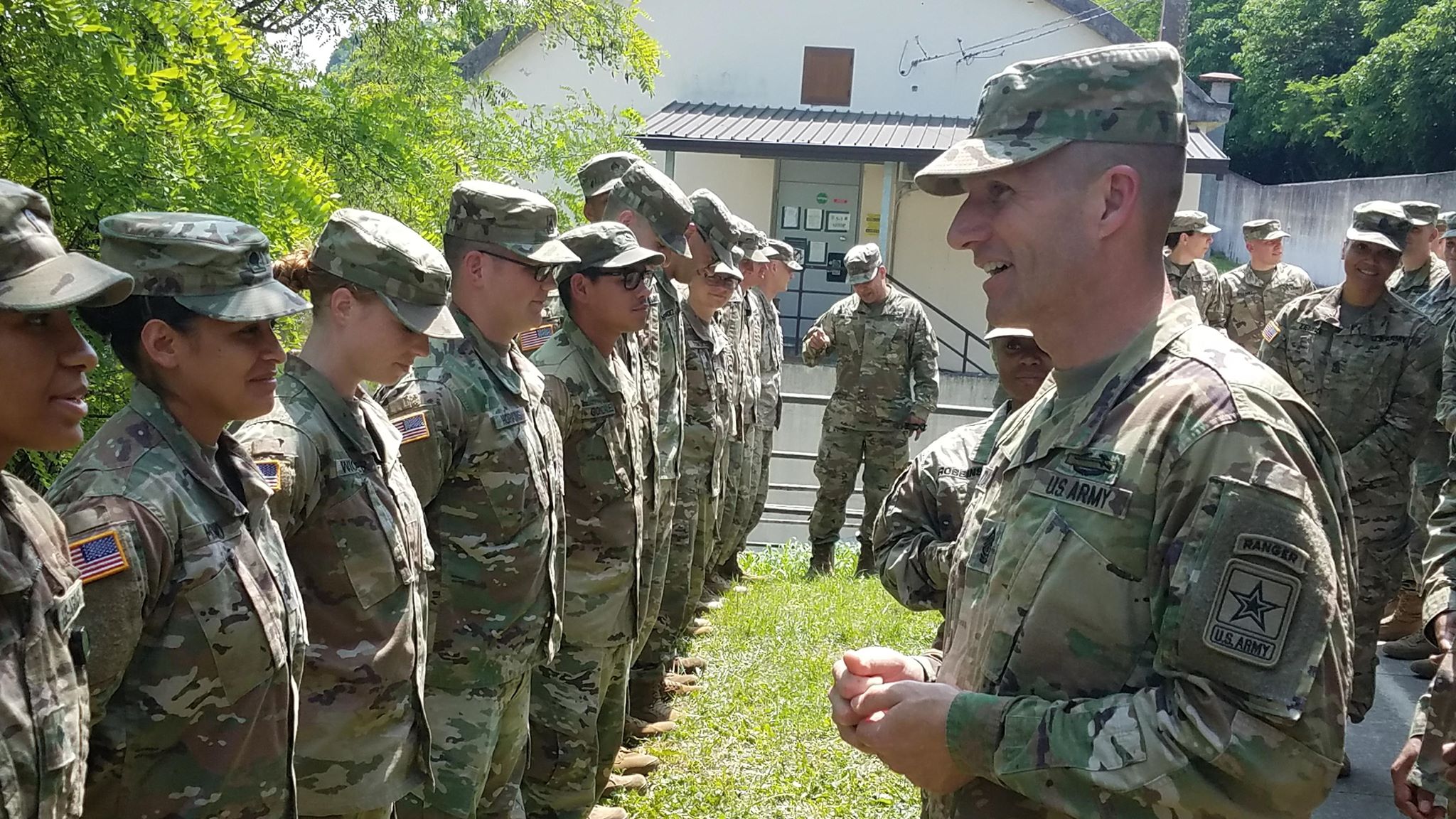 Sgt. Maj. of the Army Daniel A. Dailey visits troops of the 307th Military Intelligence Battalion at the Longare U.S. Army Base, Longare, Italy, May 31, 2018. Dailey spoke to Soldiers about their time in Italy, their missions and any concerns they may have. Dailey then presented the SMA coin to select Soldiers.