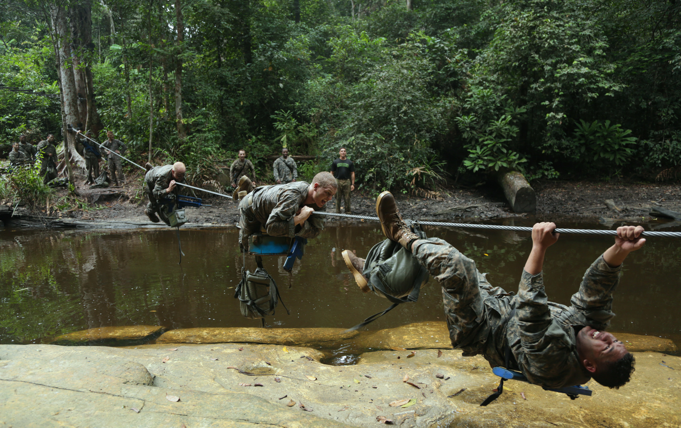 U.S. Army Soldiers assigned to Bravo Co. 3rd Battalion, 7th Infantry Regiment, 2nd Infantry Brigade Combat Team, 3rd Infantry Division, move gear across a wire during the team obstacle course at the French Jungle Warfare School in Gabon, June 10, 2016. Soldiers attended the French Jungle Warfare School as part of U.S. Army Africa's exercise Central Accord 2016, an annual, combined, joint military exercise that brings together partner nations to practice and demonstrate proficiency in conducting peacekeeping operation. (U.S. Army photo by Yvette Zabala-Garriga)