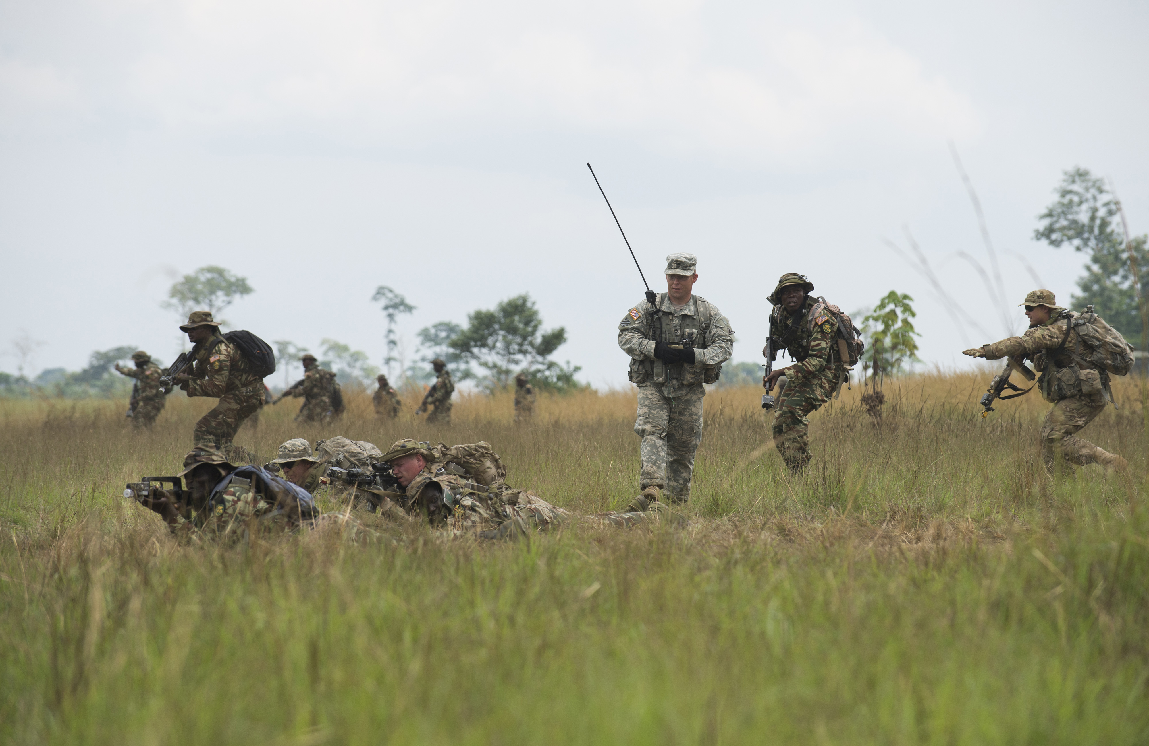 An U.S. Army Soldier and a Cameroonian Armed Forces soldier work together to secure a checkpoint during a simulated tactical movement at this year’s Central Accord exercise in Libreville, Gabon, on June 21, 2016. U.S. Army Africa’s exercise Central Accord 2016 is an annual, combined, joint military exercise that brings together partner nations to practice and demonstrate proficiency in conducting peacekeeping operations. (Defense Department photo by Tech. Sgt. Brian Kimball)