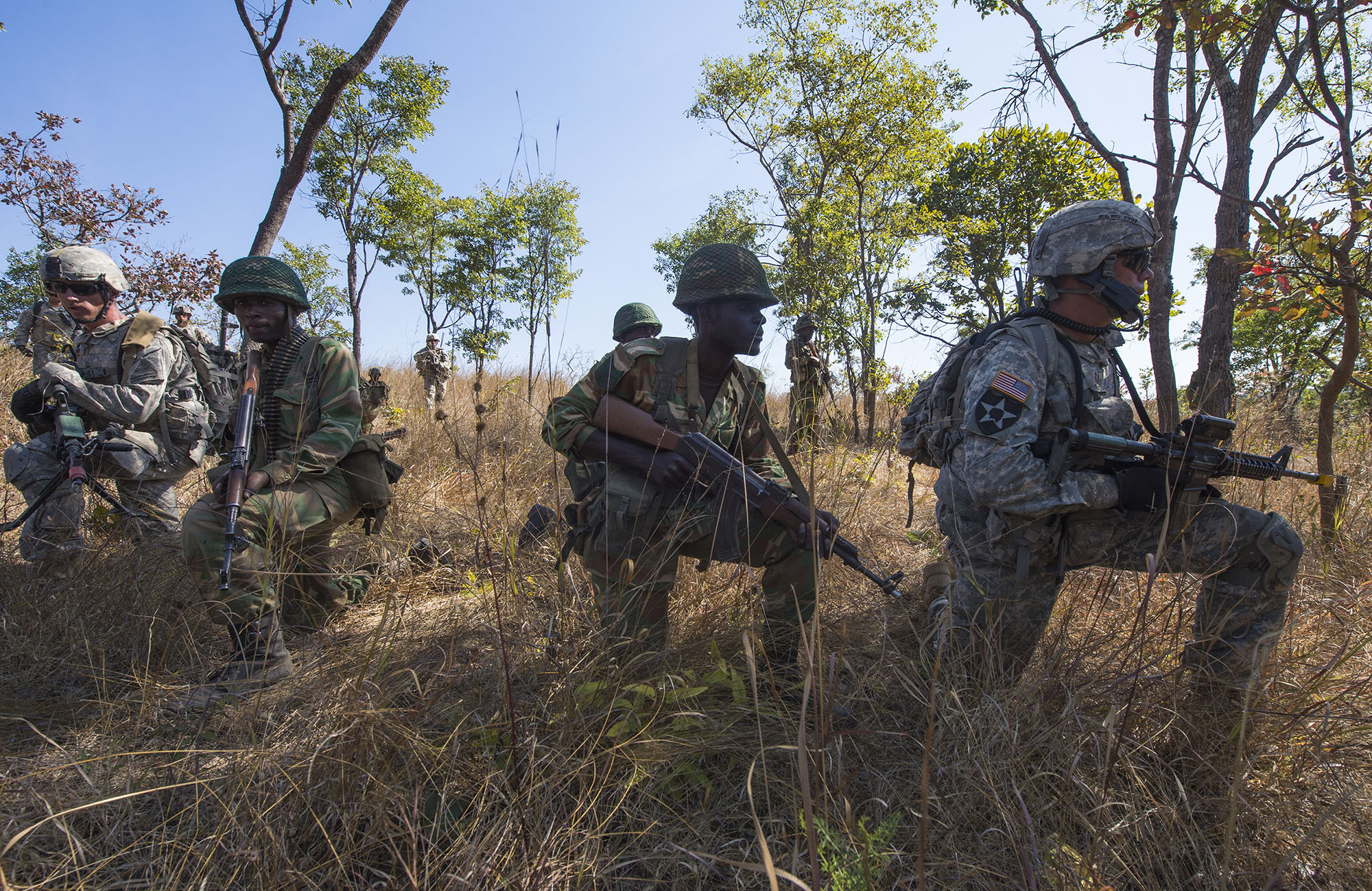 U.S. Army Soldiers and members from the Zambian Defense Force work together during a daytime tactical movement at exercise Southern Accord 15 in Lusaka, Zambia, Aug. 5, 2015. The exercise provided U.S. military, United Nation allies and the Zambian Defense Force an opportunity to work and train together as a combined joint peacekeeping allied force. (U.S. Army Africa photo by Staff Sgt. Brian Kimball)