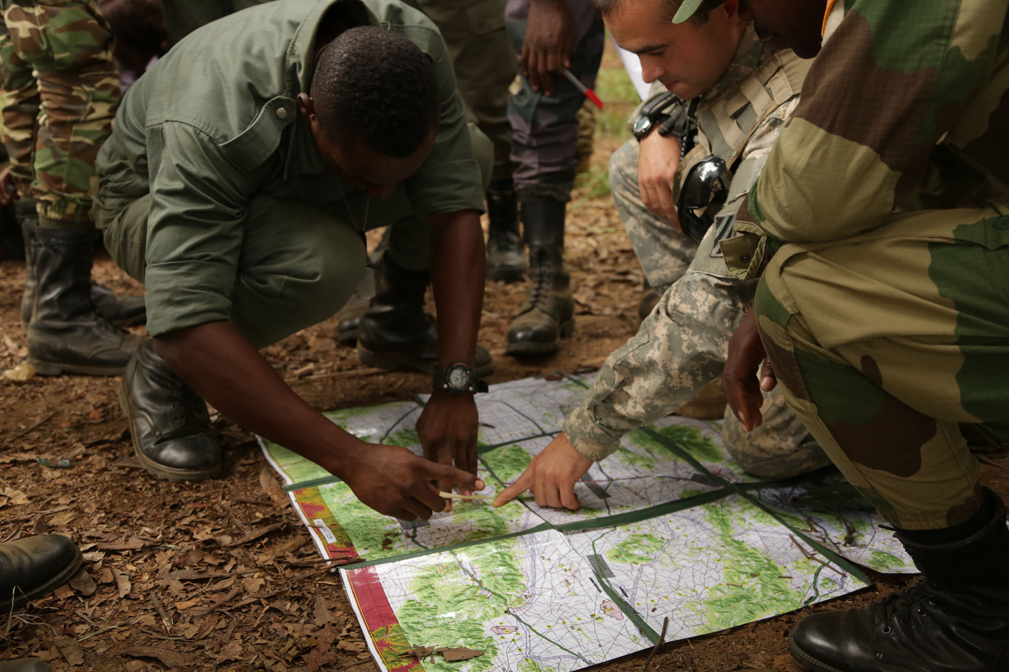 U.S. Army Sgt. 1st Class Dennis B. Unger, assigned to Bravo Co. 3rd Battalion, 7th Infantry Regiment, 2nd Infantry Brigade Combat Team, 3rd Infantry Division, from Hinesville, Ga., plots points on a map with a Gabonese service member during exercise Central Accord 16 in Gabon, June 17, 2016. U.S. Army Africa's exercise Central Accord is an annual, combined, joint military exercise that brings together partner nations to practice and demonstrate proficiency in conducting peacekeeping operations. (U.S. Army photo by Spc. Yvette Zabala-Garriga)