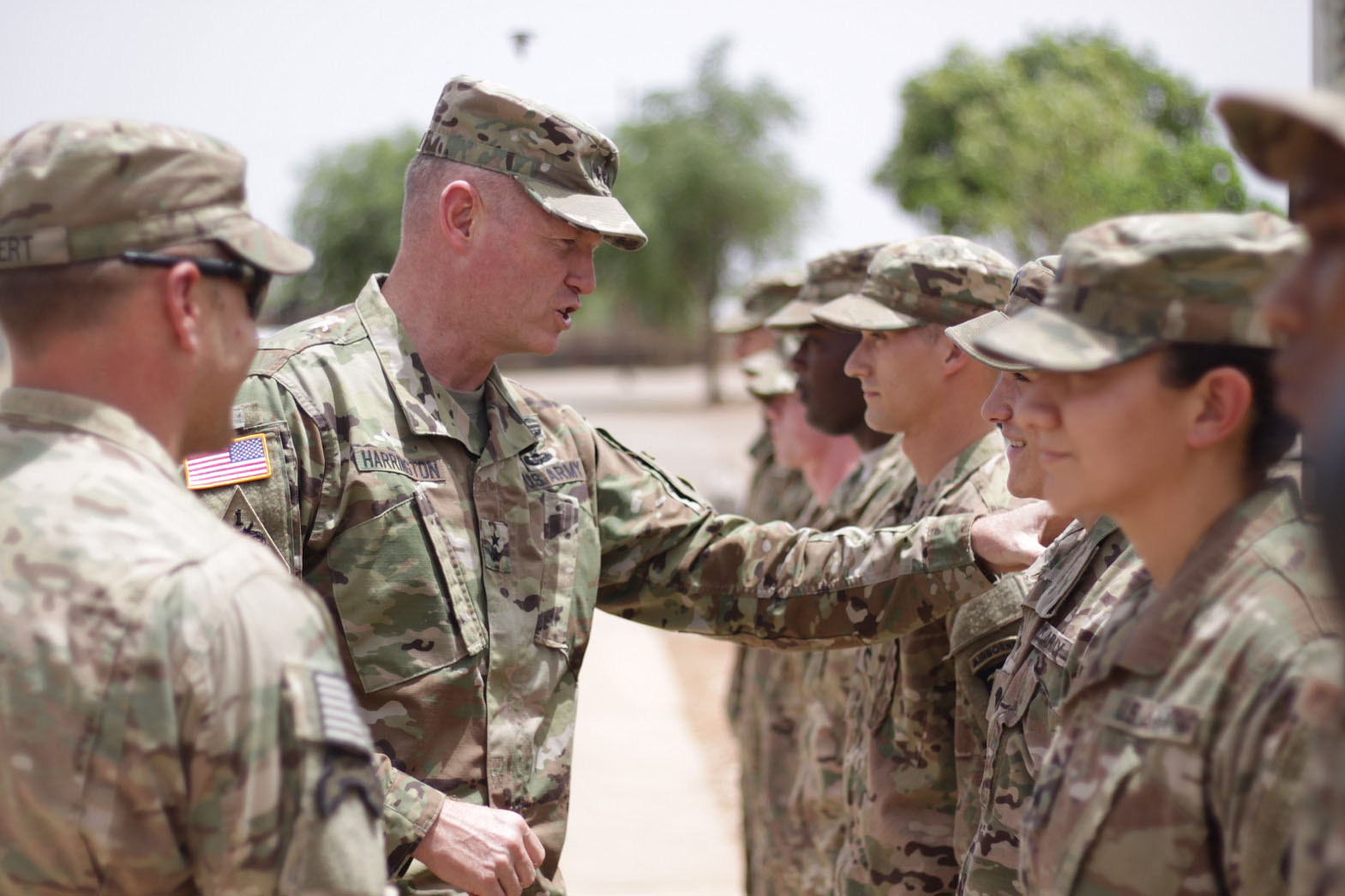 During a visit to Contingency Location Garoua, Cameroon, U.S. Army Africa Commander Maj. Gen. Joseph Harrington expresses appreciation and presents coins to Soldiers from the 1st Battalion, 506th Infantry Regiment, 1st Brigade Combat Team, 101st Airborne Division (Air Assault), in a ceremony April 27, 2017. The Soldiers are deployed as part of the U.S. Army’s regionally aligned forces in Africa. (U.S. Army photo)