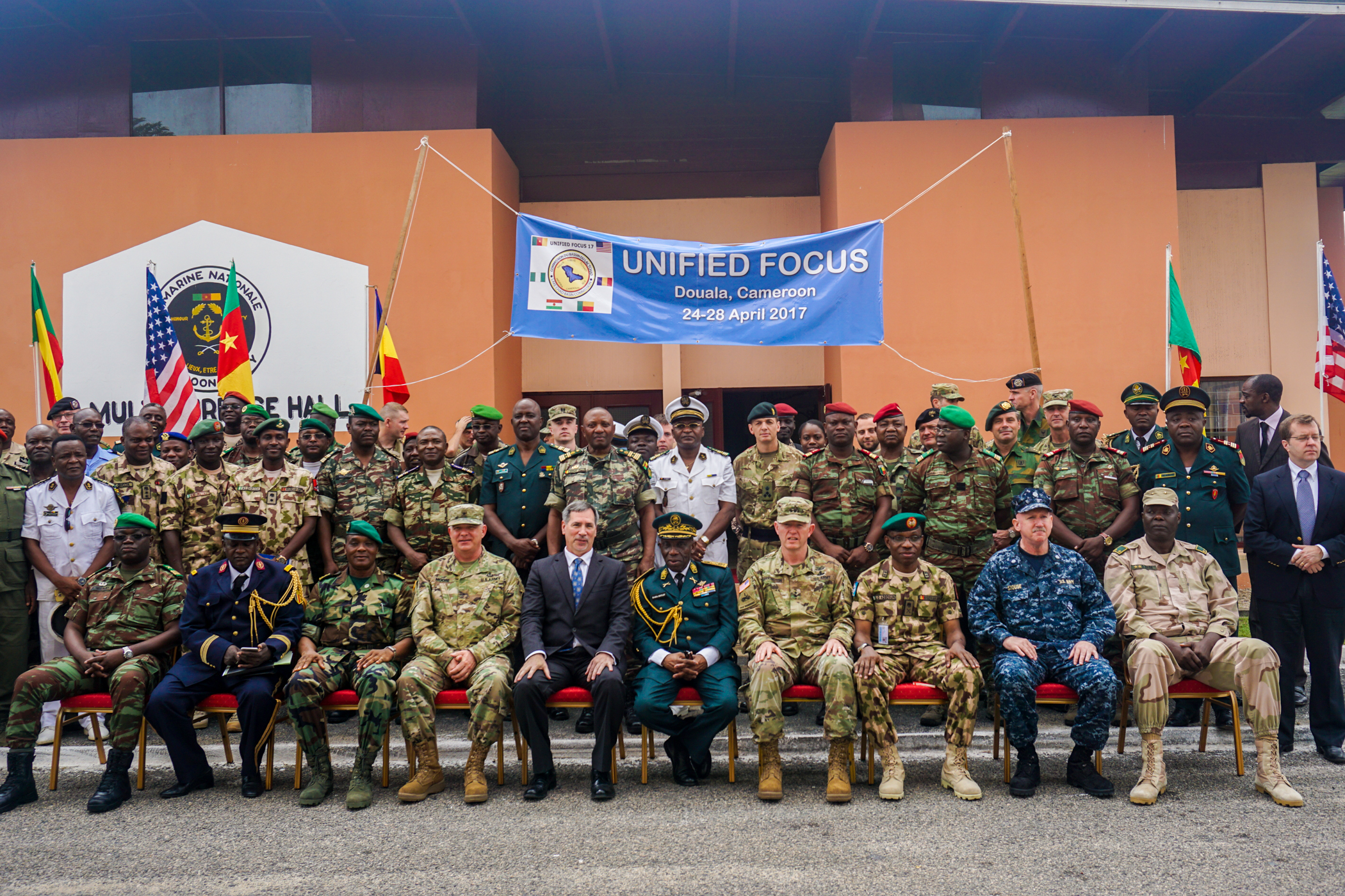 Military and civilian representatives from over 10 nations pose for a group photo at the closing ceremony for Exercise Unified Focus 2017, held at the Douala Naval Base, Cameroon, April 28, 2017. UF 17 is a weeklong tabletop exercise that brings the military partners of the Lake Chad basin area’s Multinational Joint Task Force (MNJTF) together to practice joint planning and coordination through a series of scripted vignettes.