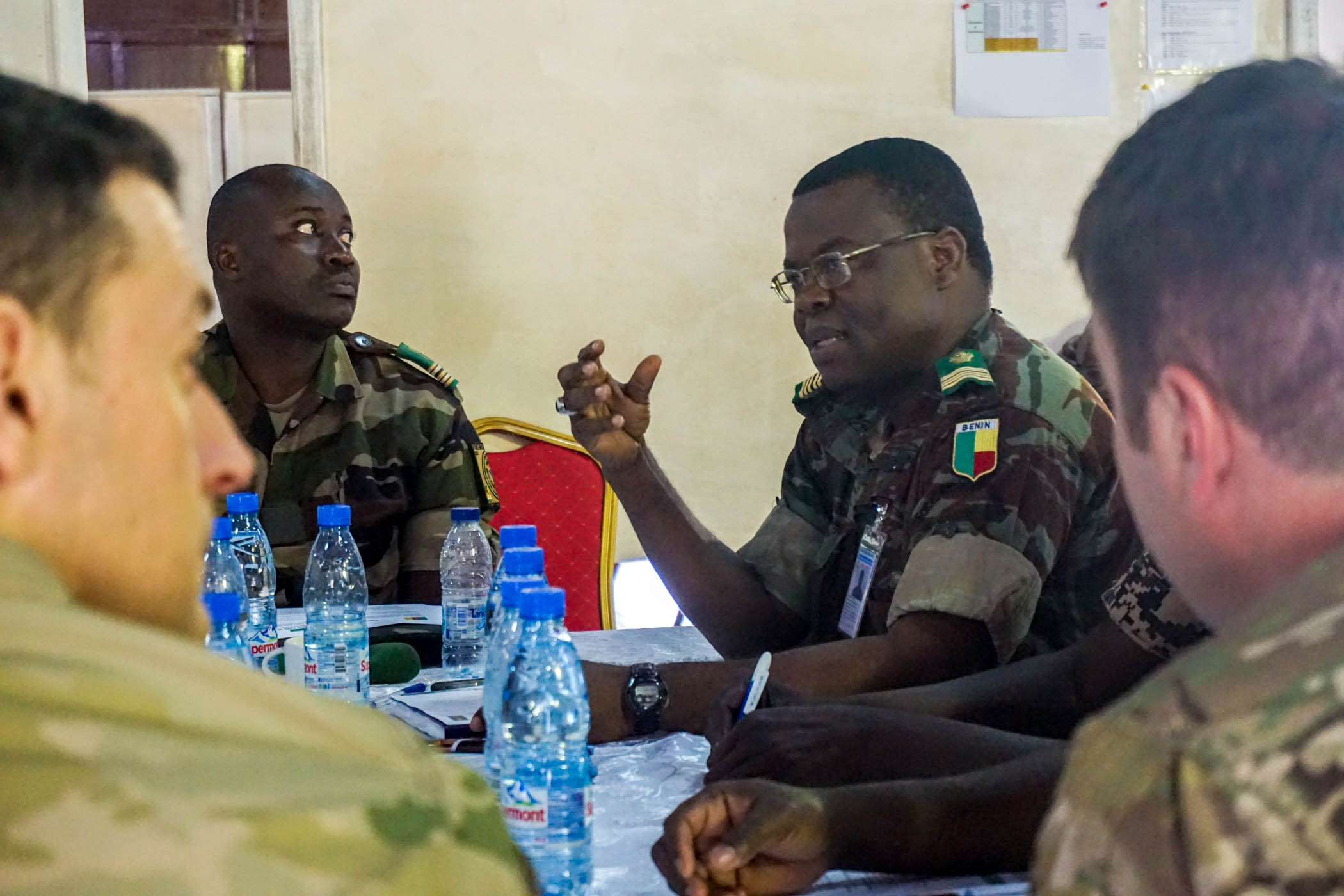 A Benin military officer briefs his working group during discussions at Exercise Unified Focus 2017, held at the Douala Naval Base, Cameroon, April 27, 2017. UF 17 is a weeklong tabletop exercise that brings the military partners of the Lake Chad basin area’s Multinational Joint Task Force (MNJTF) together to practice joint planning and coordination through a series of scripted vignettes.