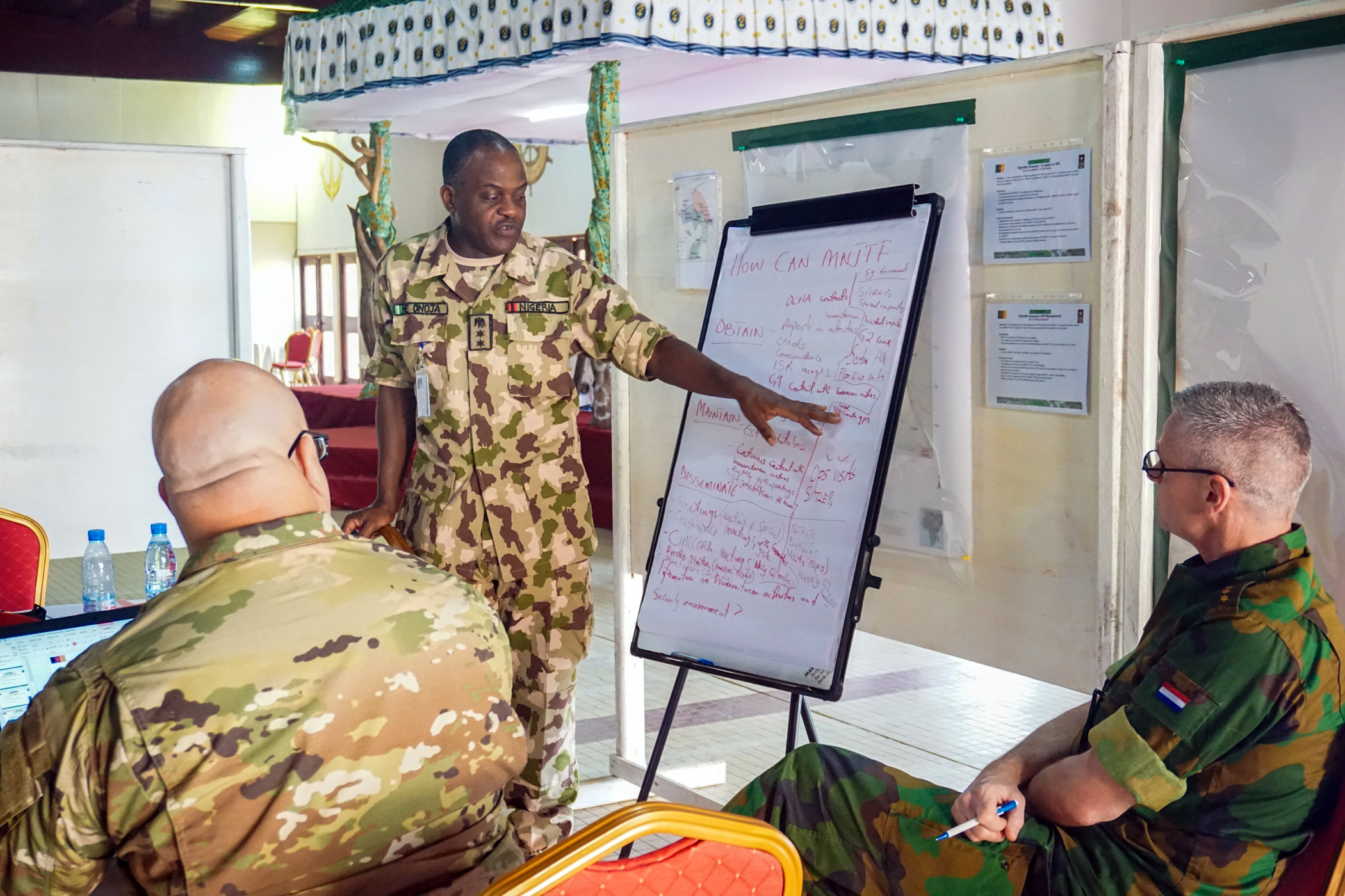 Exercise participants from more than 10 nations discuss interagency cooperation during working groups at Exercise Unified Focus, April 26, 2017, at the Douala Naval Base, Cameroon. UF 17 is a weeklong tabletop exercise that brings the military partners of the Lake Chad basin area’s Multinational Joint Task Force (MNJTF) together to practice joint planning and coordination through a series of scripted vignettes.