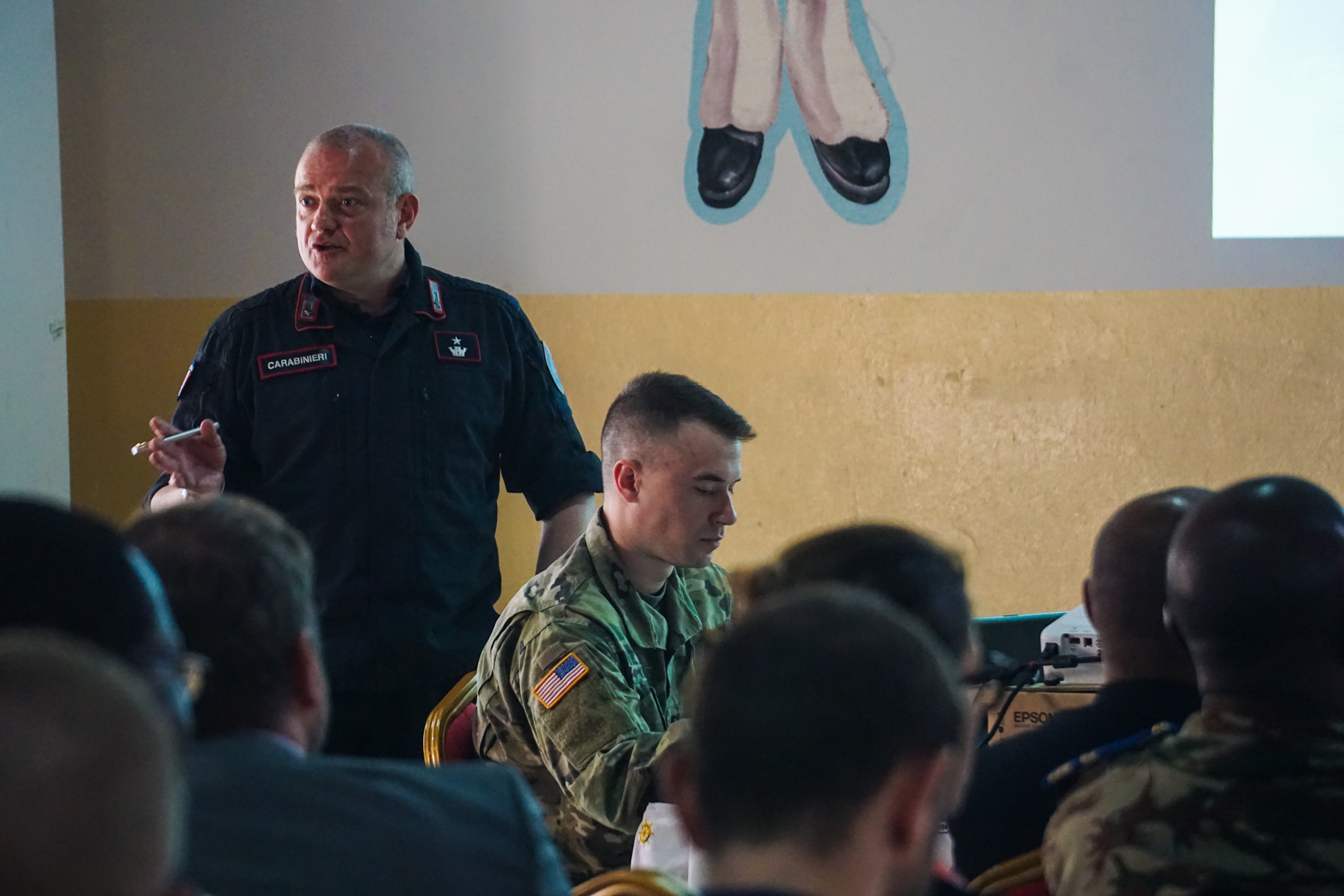 Italian Carabinieri Maj. Alessandro Criscitiello briefs Unified Focus 2017 participants on police units’ responsibilities during peacekeeping operations April 25, 2017, at the Douala Naval Base. UF 17 is a weeklong tabletop exercise that brings the military partners of the Lake Chad basin area’s Multinational Joint Task Force (MNJTF) together to practice joint planning and coordination through a series of scripted vignettes.
