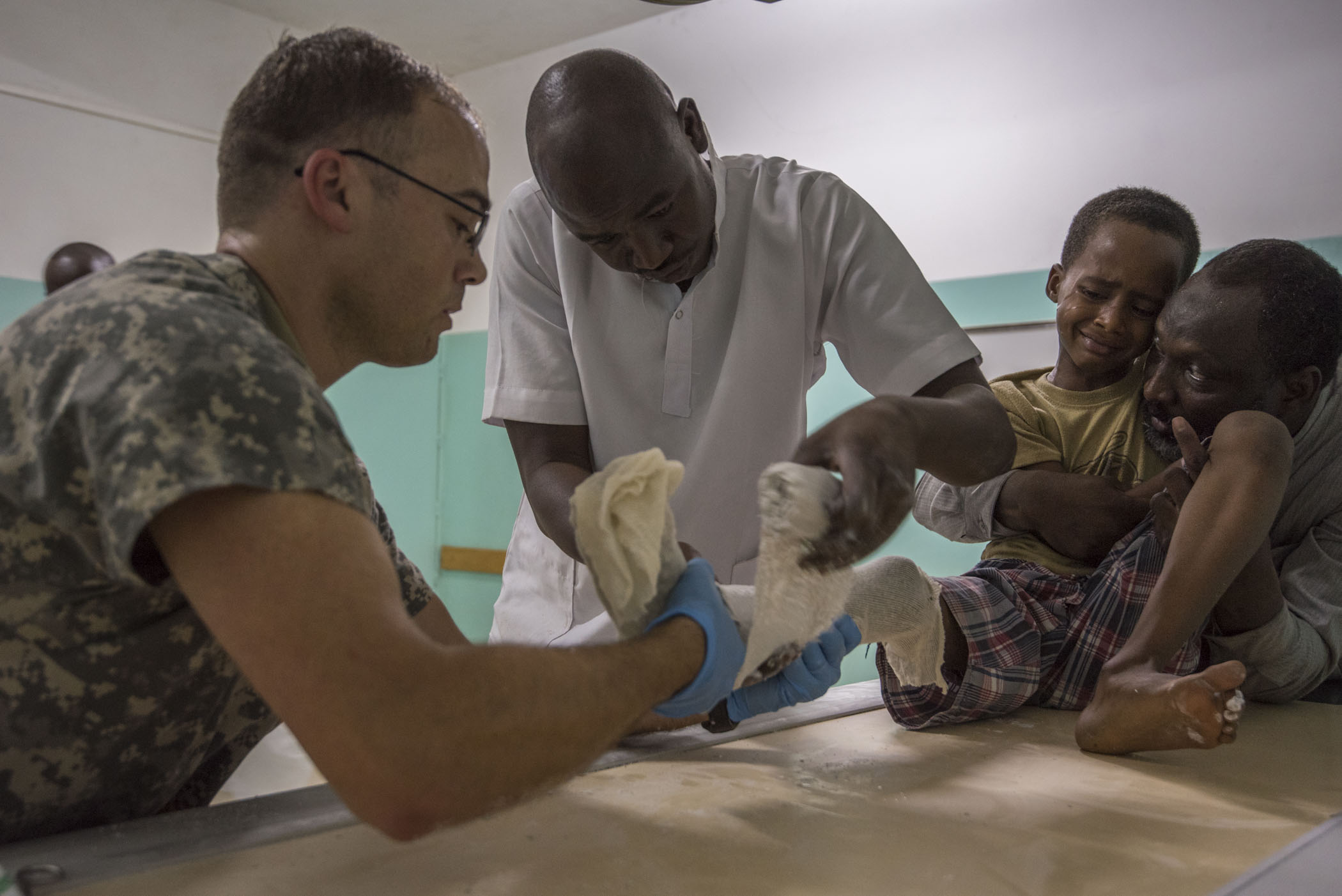 U.S. Army Reserve Sgt. Christopher Mason, a practicing nurse specialist, assigned to 3rd Medical Command Deployment Support in Forest Park, Ga., and his Chadian counterpart reset a broken leg before casting it during Medical Readiness Training Exercise 17-3 at the Military Teaching Hospital in N'Djamena, Chad, May 4. The mutually beneficial exercise offers opportunities for the partnered militaries to share best practices and improve medical treatment processes. (U.S. Army Africa photo by Staff Sgt. Shejal Pulivarti)