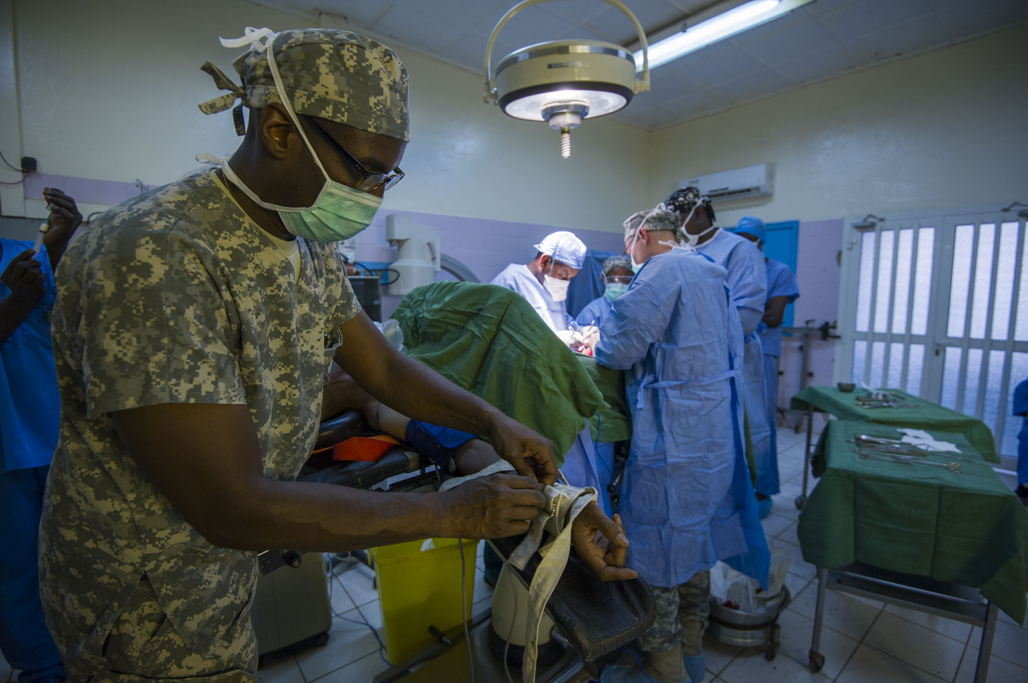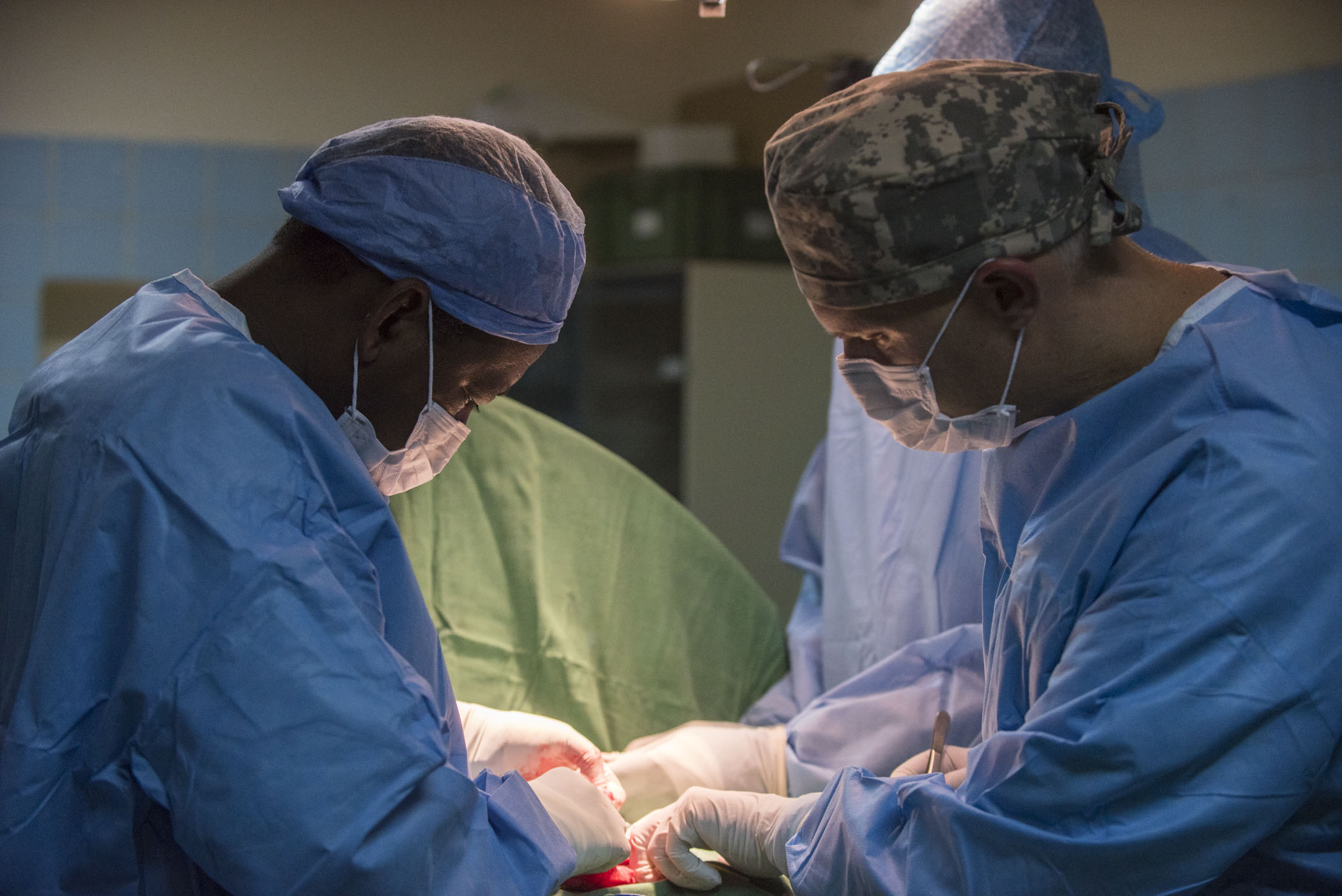 Chadian Col. Bakhit Saleh Harane, surgeon, and U.S. Army Reserve Maj. Michael Shotwell, general surgeon, assigned to 3rd Medical Command Deployment Support, perform a hernia surgery together during Medical Readiness Training Exercise 17-3 at the Military Teaching Hospital in N’Djamena, Chad, May 3. The mutually beneficial exercise offers opportunities for the partnered militaries to share best practices and improve medical treatment processes. (U.S. Army Africa photo by Staff Sgt. Shejal Pulivarti)