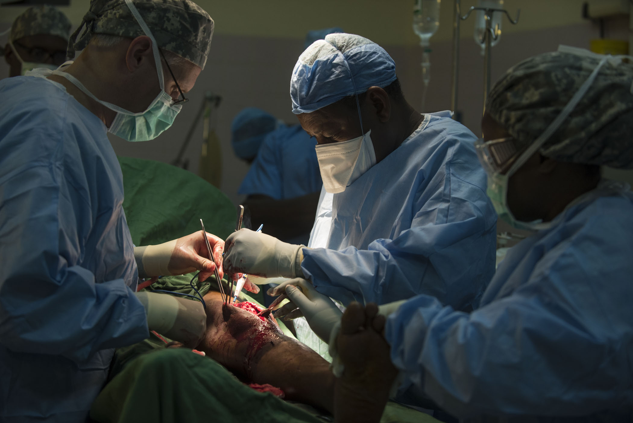 U.S. Army Reserve Maj. Michael Shotwell, a general surgeon, assigned to 3rd Medical Command Deployment Support in Forest Park, Ga., and Chadian Col. Bakhit Saleh Harane, a surgeon, perform a patella repair surgery during Medical Readiness Training Exercise 17-3 at the Military Teaching Hospital in N'Djamena, Chad, May 8. The mutually beneficial exercise offers opportunities for the partnered militaries to share best practices and improve medical treatment processes. (U.S. Army Africa photo by Staff Sgt. Shejal Pulivarti)