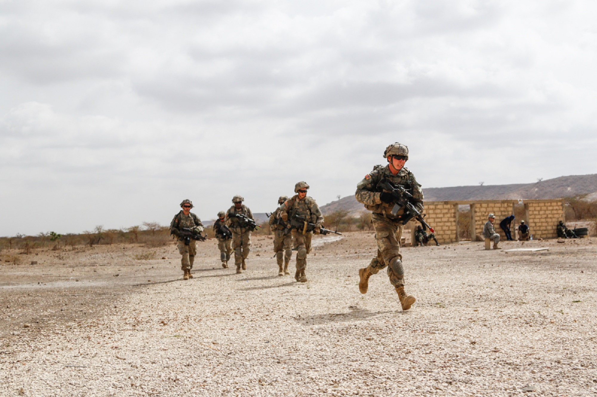 U.S. Army infantrymen with Bravo Company, 1st Battalion, 30th Infantry Regiment, 2nd Infantry Brigade Combat Team, 3rd Infantry Division move toward an objective during urban operations training July 18, 2016 in Thies, Senegal as part of Africa Readiness Training 16. ART16 is a U.S. Army Africa exercise designed to increase U.S. and Senegalese readiness and partnership through combined infantry training and live-fire events. (US Army Photo by Spc. Craig Philbrick)