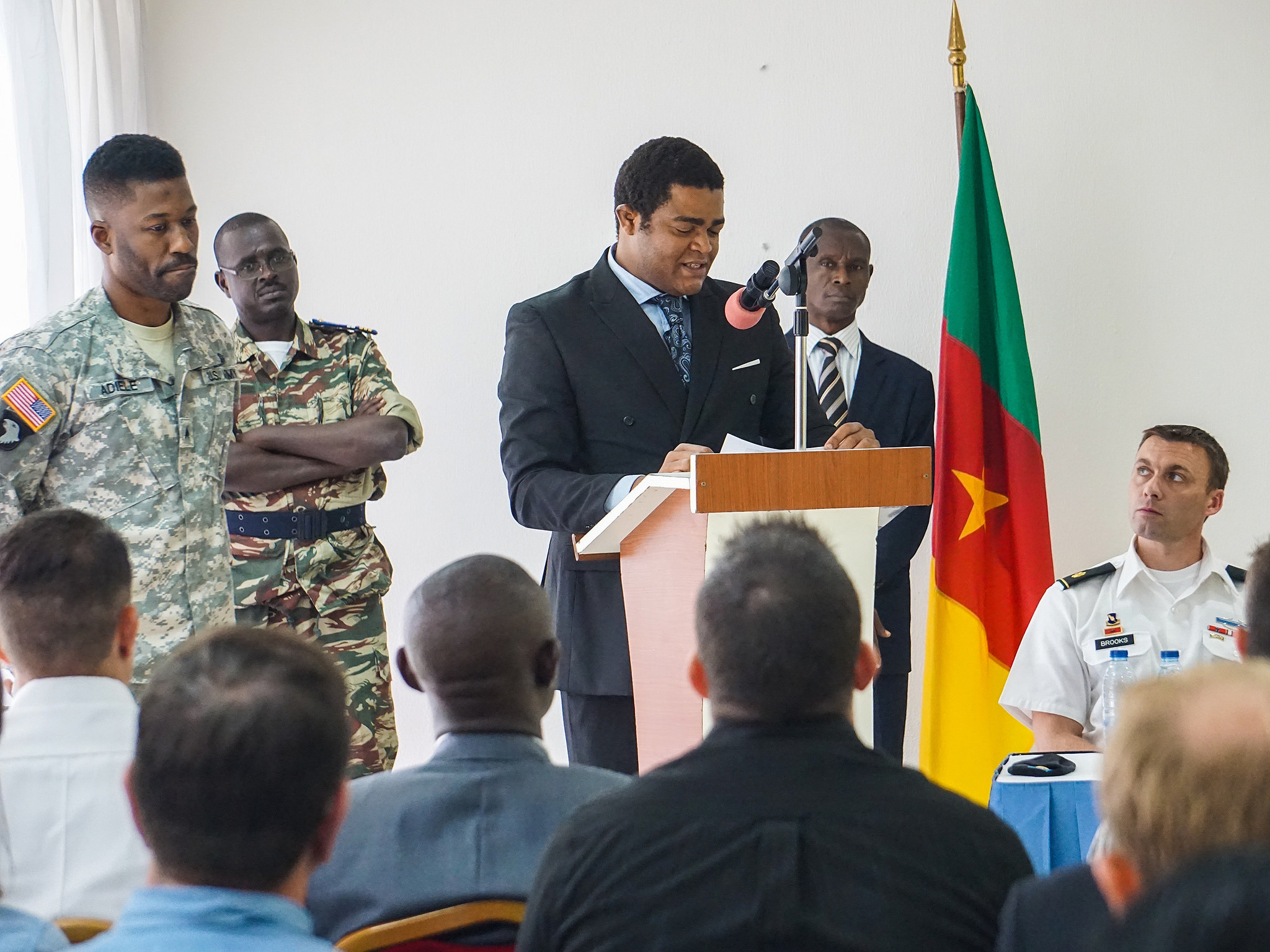 Ludovic Etienne Ngwba, Secretary General in the Littoral Governorâs Office, provides opening remarks while Sgt. Brian Adiele, French linguist from the 300th Military Intelligence Battalion of the Utah National Guard, waits to translate during the opening ceremony for the Unified Focus 2017 initial planning event (IPE), Douala, Cameroon, Oct. 11, 2016.