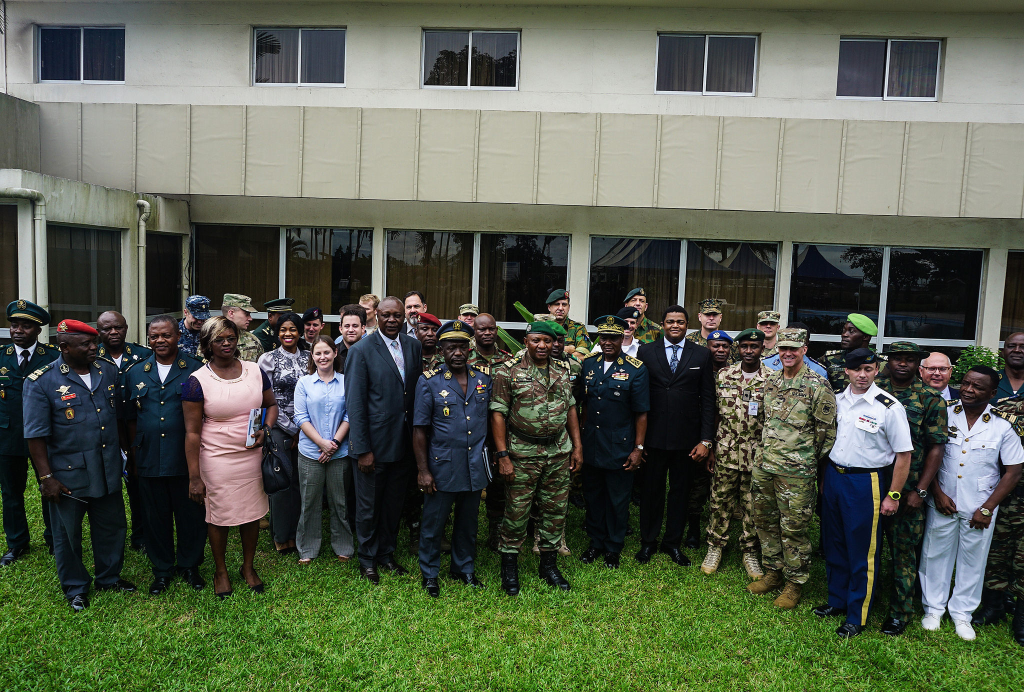 Planners from 7 partner nations and distinguished guests pose for a group photo following the opening ceremony for the Unified Focus 2017 initial planning event (IPE), Douala, Cameroon, Oct. 11, 2016. The UF17 IPE brought partner nation planners together for the first time to discuss and begin shaping the inaugural Unified Focus exercise designed to enhance and enable Lake Chad Basin Commission nations to support the Multinational Joint Task Force (MNJTF) counter-Boko Haram operations.