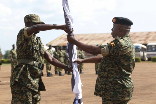 Uganda People’s Defence Force (UPDF) Brig. Gen. James Ruhesi (right), exercise JA18 UPDF co-director, passes the exercise flag over to another UPDF soldier to signify the commencement of Justified Accord 2018, Jinja, Uganda, June 23, 2018. Justified Accord is a two-week combined and joint exercise designed to demonstrate the capacity and capability of participants in peacekeeping operations and employing the African Union Mission in Somalia procedures.(U.S. Army photo by Spc. Angelica Gardner)
