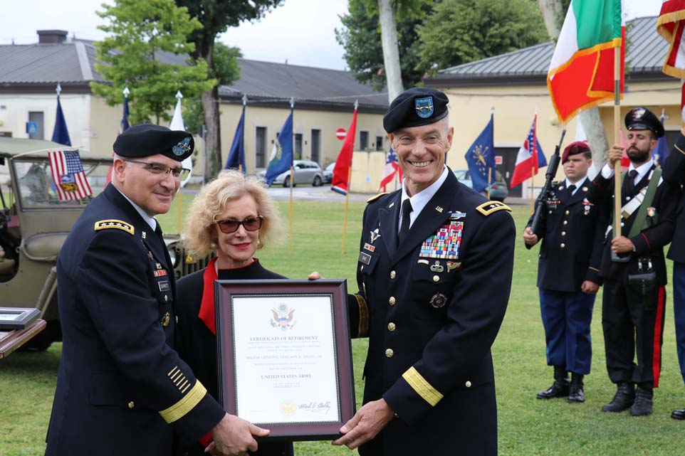 Gen. Curtis M. Scaparrotti presents the certificate of retirement to Maj. Gen. Gordon Skip Davis, Jr. on June 22, 2018.