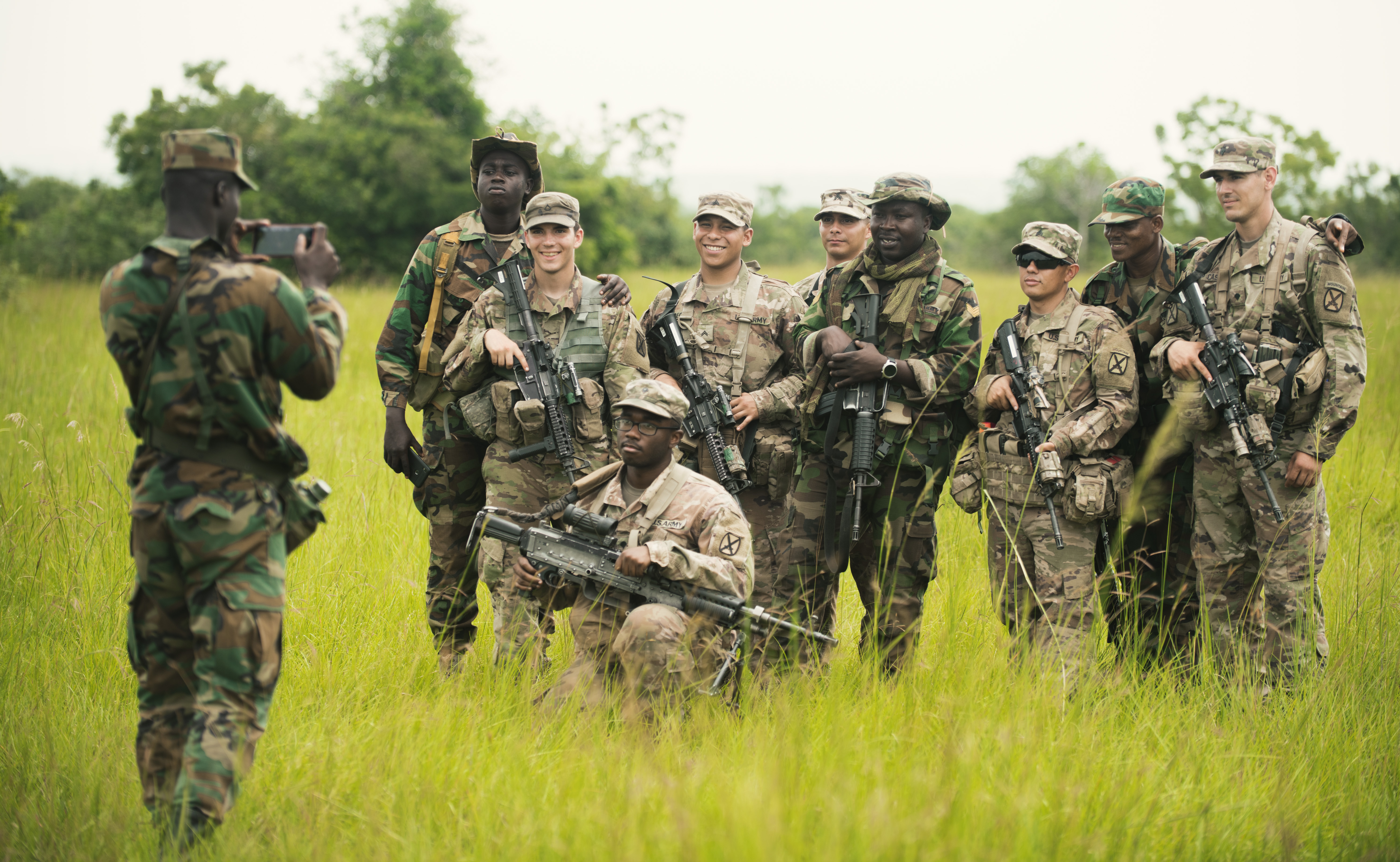 Ghanaian and U.S. Army Soldiers pause during United Accord's FTX to take a photo to share with friends and family.