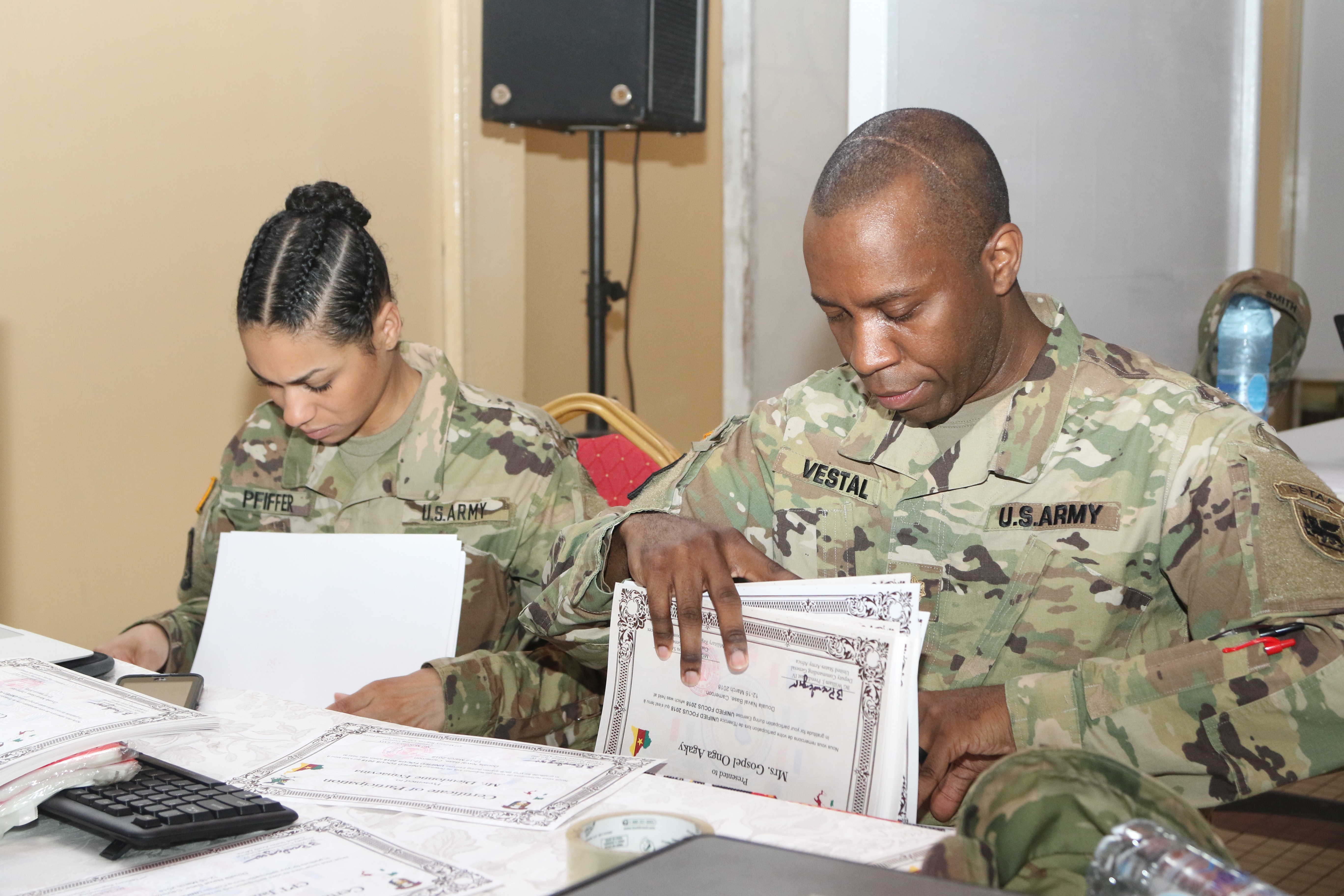 SSG Jessica Pfiffer and Maj. Jamie Vestal, prepare more than 200 certificates to be handed out at the closing ceremony for Unified Focus 2018 in Douala, Cameroon.