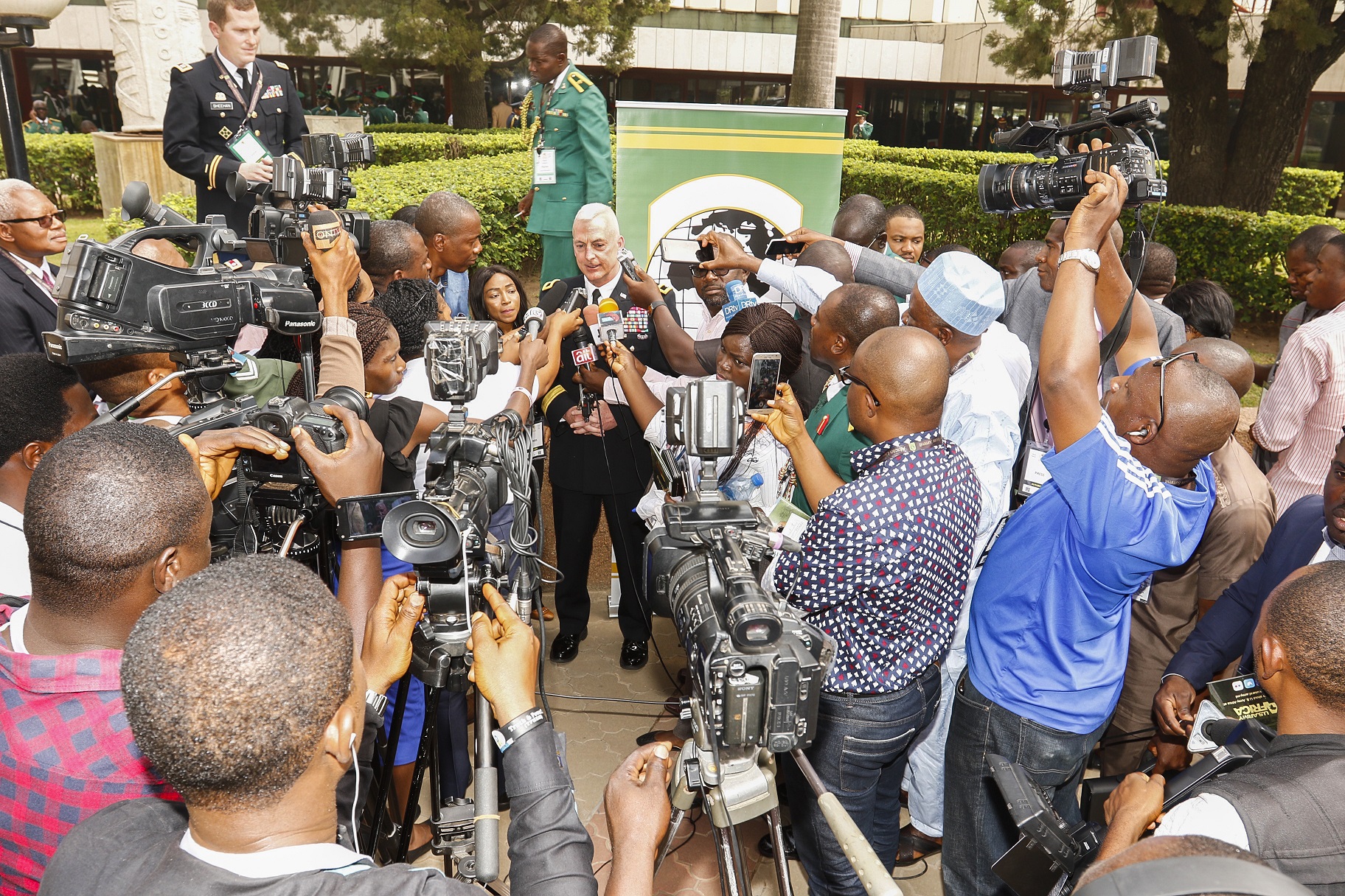 Brig. Gen. Eugene J. LeBoeuf, USARAF acting commanding general, discusses African Land Forces Summit 2018 with media during the opening day in Abuja, Nigeria, April 16, 2018.