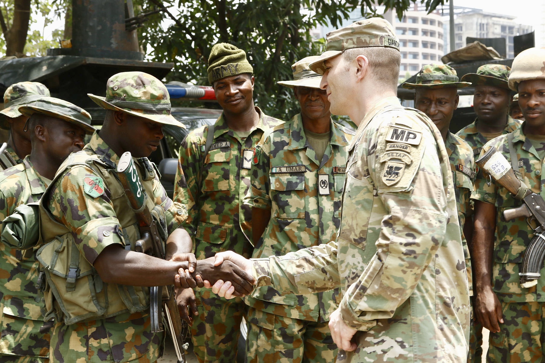 U.S. Army Africa Provost Marshal, Maj. Craig Giancaterino, thanks Nigerian Army Soldiers for providing force protection during ALFS 2018.