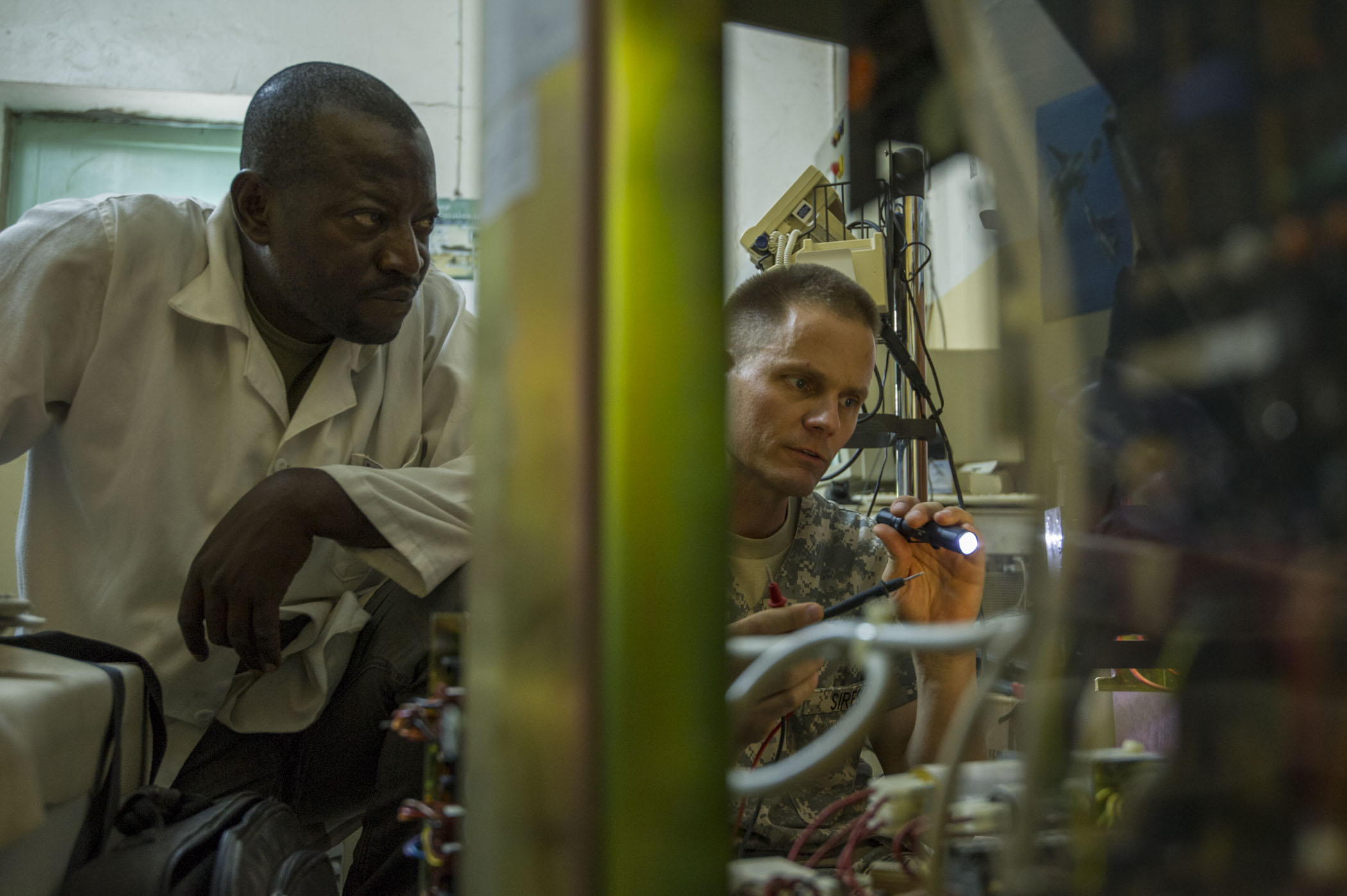Chadian Lt. Djenaissem Bekoutou, a biomedical technician, and U.S. Army Reserve Chief Warrant Officer 2 Doug Sires, a health services maintenance technician, assigned to 3rd Medical Command Deployment Support in Forest Park, Ga., run diagnostics on a c-arm machine during Medical Readiness Training Exercise 17-3 at the Military Teaching Hospital in N'Djamena, Chad, May 10. The mutually beneficial exercise offers opportunities for the partnered militaries to share best practices and improve medical treatment processes. (U.S. Army Africa photo by Staff Sgt. Shejal Pulivarti)
