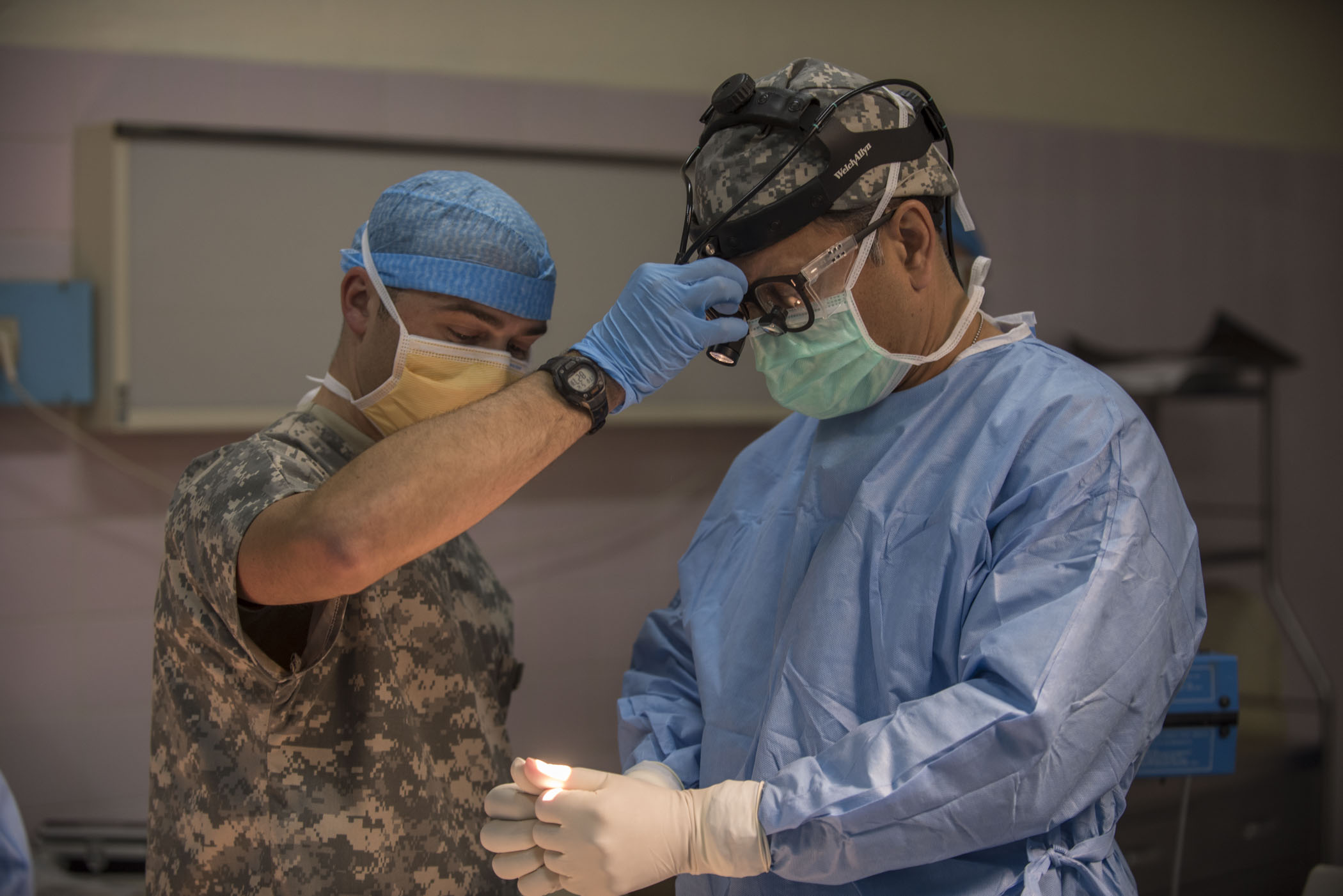 U.S. Army Reserve Sgt. Christopher Mason, a practicing nurse specialist, helps Col. Christopher Sinha, an ear, nose and throat surgeon adjust his headlight prior to a thyroidectomy during Medical Readiness Training Exercise 17-3 at the Military Teaching Hospital in N'Djamena, Chad, May 12. The mutually beneficial exercise offers opportunities for the partnered militaries to share best practices and improve medical treatment processes. (U.S. Army Africa photo by Staff Sgt. Shejal Pulivarti)