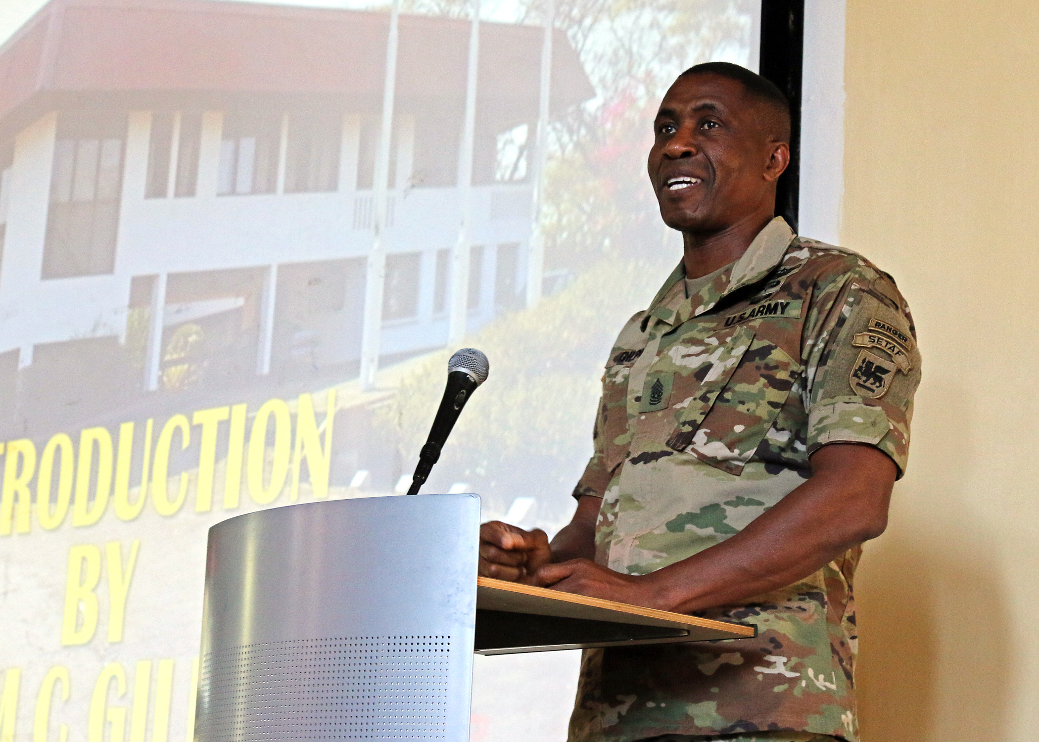 Command Sgt. Maj. Christopher Gilpin, a senior noncommissioned officer in U.S. Army Africa, gives an introduction to senior enlisted military leaders from nine countries across the African continent and Malawi Defence Force soldiers enrolled in the Malawi Armed Forces College Sergeants Major Course during the first African Land Forces Summit Senior Enlisted Program, in Salima, Malawi, May 9, 2017. ALFS is an annual, weeklong seminar bringing together land force chiefs from across Africa for candid dialog to discuss and develop cooperative solutions to regional and transregional challenges and threats. (U.S. Army photo by Sgt. Paige Behringer)