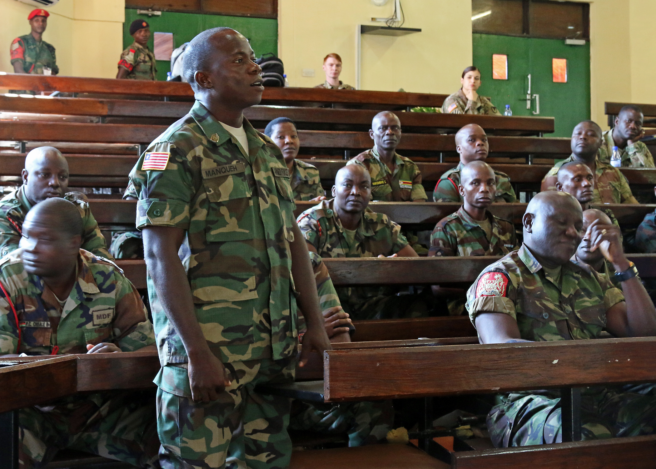 Command Sgt. Maj. Cooper Manqueh, a senior noncommissioned officer in the Liberian army, gives his introduction to senior enlisted military leaders from nine countries across the African continent, U.S. counterparts and Malawi Defence Force soldiers enrolled in the Malawi Armed Forces College Sergeants Major Course during the first African Land Forces Summit Senior Enlisted Program, in Salima, Malawi, May 9, 2017. ALFS is an annual, weeklong seminar bringing together land force chiefs from across Africa for candid dialog to discuss and develop cooperative solutions to regional and transregional challenges and threats. (U.S. Army photo by Sgt. Paige Behringer)