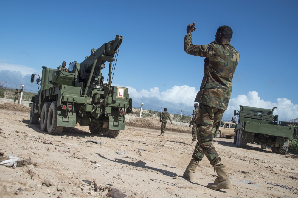 Somali National Army soldiers of the Danab battalion conduct convoy operations training with the U.S. Army’s 101st Airborne Division May 22, 2017, in Mogadishu, Somalia. The logistics course focused on various aspects of moving personnel, equipment and supplies. (U.S. Air National Guard photo by Tech. Sgt. Joe Harwood)