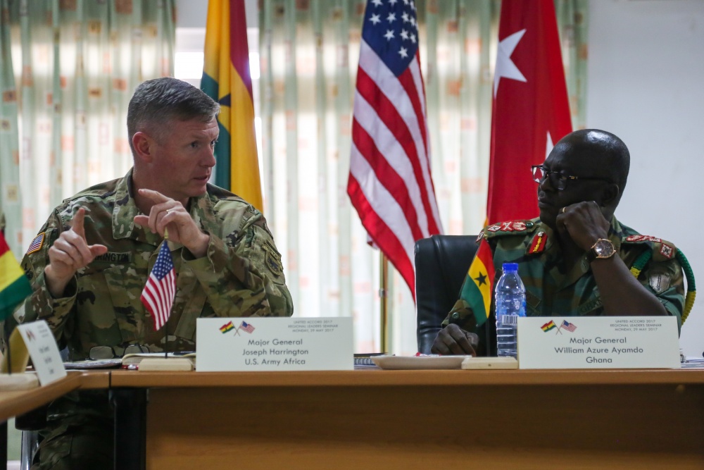U.S. Army Maj. Gen. Joseph P. Harrington, commanding general of U.S. Army Africa, and Ghana Armed Forces Maj. General William Azure Ayamdo, chief of the Army Staff, discuss key topics promoting regional relationships during United Accord 2017 at the Kofi Annan International Peacekeeping Training Centre in Accra, Ghana, May 29, 2017. United Accord (formerly Western Accord) 2017 is an annual, combined, joint military exercise that promotes regional relationships, increases capacity, trains U.S. and Western African forces, and encourages cross training and interoperability. (U.S. Army photo by Pfc. Joseph Friend)
