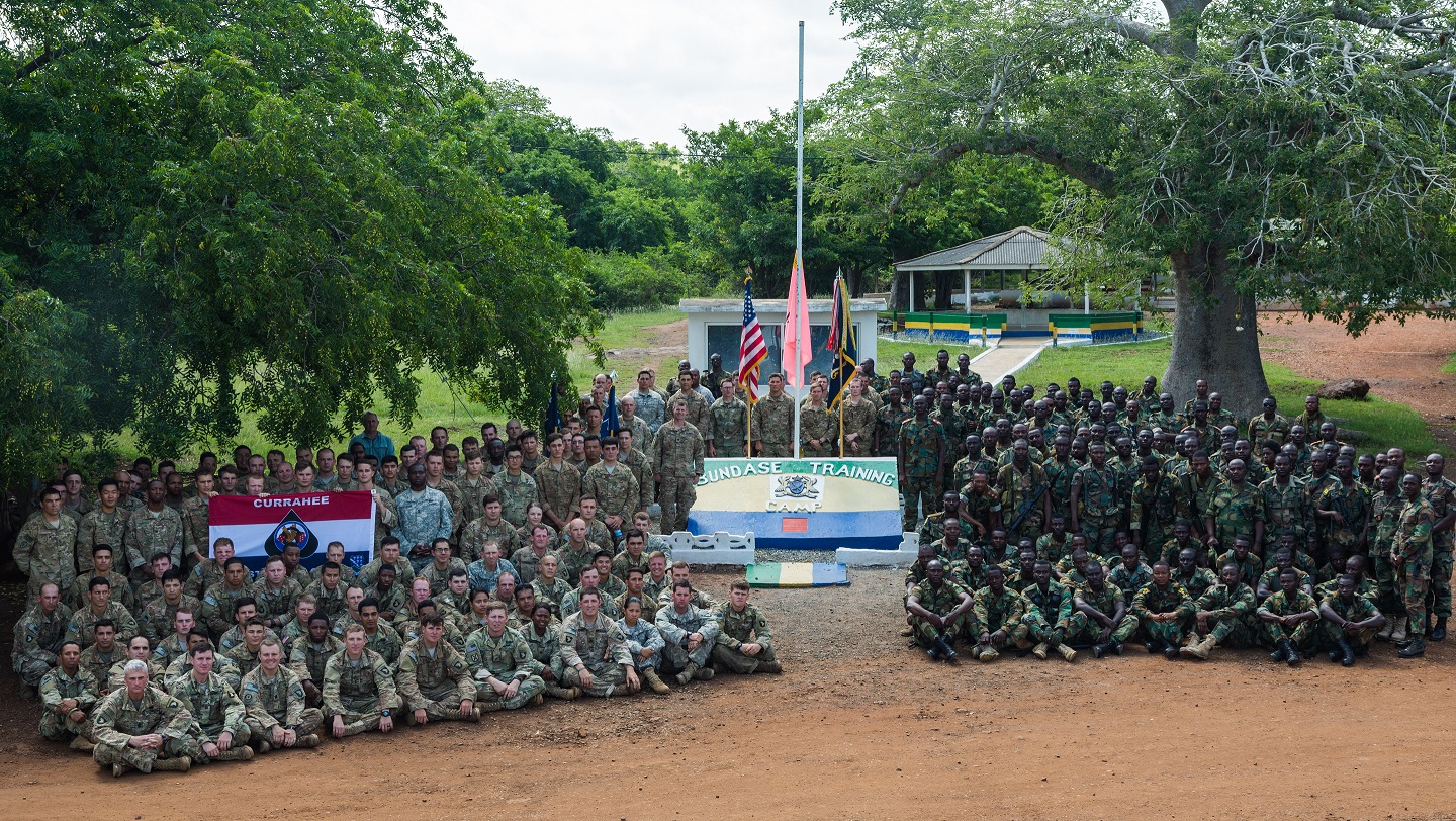 U.S. Army Soldiers assigned to the 1st Battalion, 506th Infantry Regiment, 1st Brigade Combat Team, 101st Airborne Division and Ghana Armed Forces soldiers from the 5th Infantry Battalion, Arakan Barracks, Burma Camp, pose for a group photo during United Accord 2017 at Bundase Training Camp, Bundase, Ghana, May 29, 2017. United Accord (formerly Western Accord) 2017 is an annual, combined, joint military exercise that promotes regional relationships, increases capacity, trains U.S. and Western African forces, and encourages cross training and interoperability. (U.S. Army photo by Spc. Victor Perez Vargas)