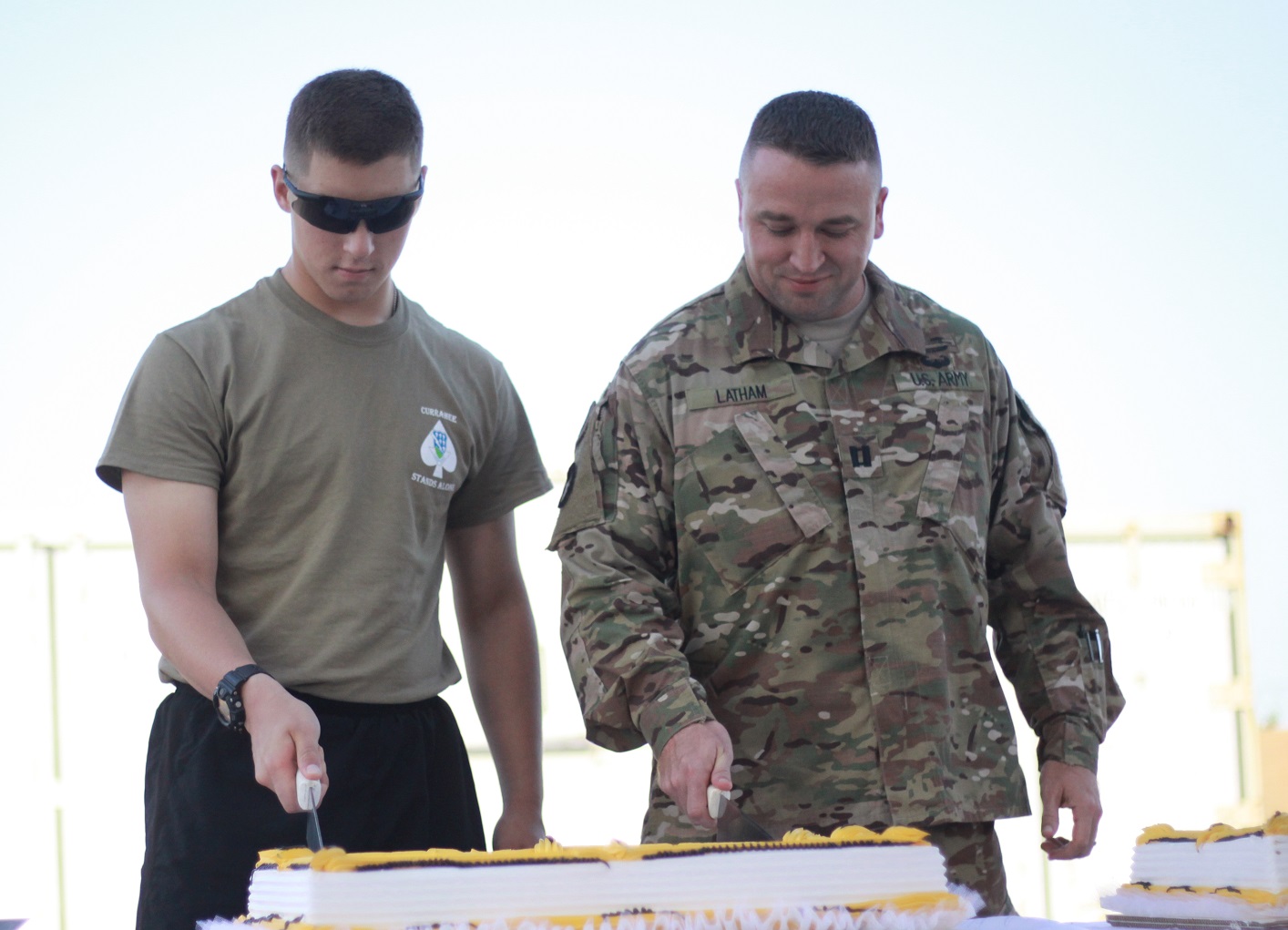 The youngest soldier at Contingency Location Garoua, Pvt. Michael Sklowdowski, and the oldest soldier, Capt. Jeremy Latham, the Task Force Toccoa executive officer, cut a cake during the U.S. Army’s 242nd birthday at Contingency Location Garoua, Cameroon, June 14. The soldiers of 1st Battalion, 506th Infantry Regiment, part of the 1st Brigade Combat Team, 101st Airborne Division, are serving in a support role for the Cameroon military’s fight against the violent extremist organization Boko Haram. (Photo by 2nd Lt. Jorge Rodriguez)