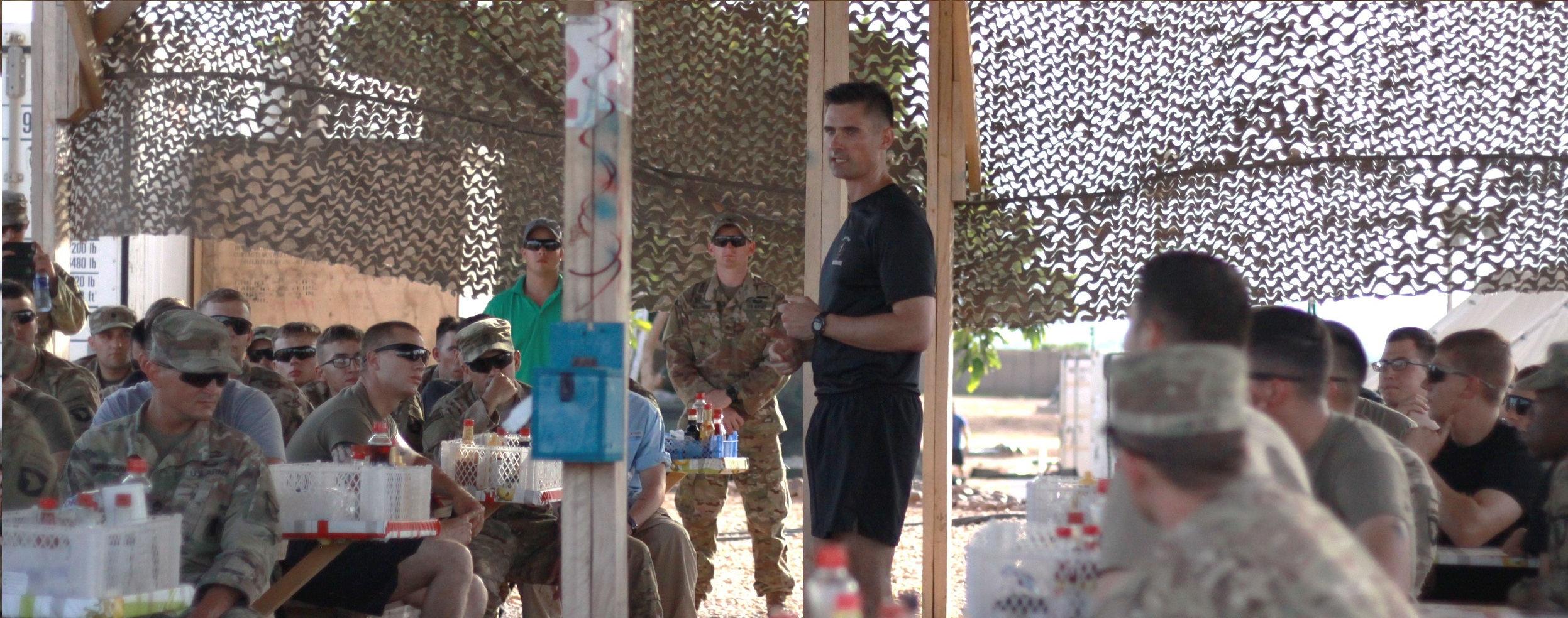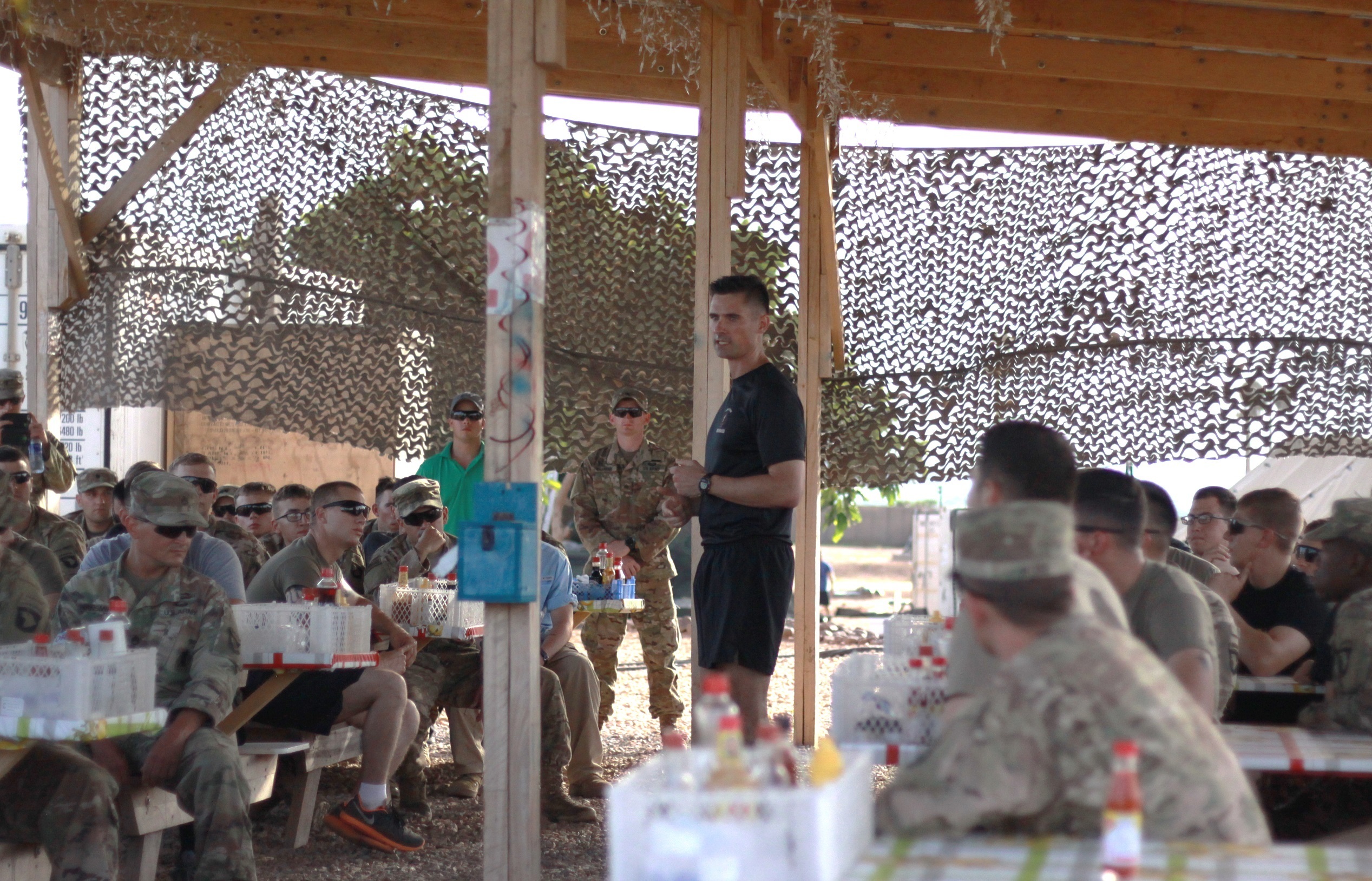 Maj. Max Ferguson, the Task Force Toccoa commander, addresses soldiers gathered to celebrate the U.S. Army’s 242nd birthday at Contingency Location Garoua, Cameroon, June 14. The soldiers of 1st Battalion, 506th Infantry Regiment, part of the 1st Brigade Combat Team, 101st Airborne Division, are serving in a support role for the Cameroon military’s fight against the violent extremist organization Boko Haram. (U.S. Army photo by 2nd Lt. Jorge Rodriguez)