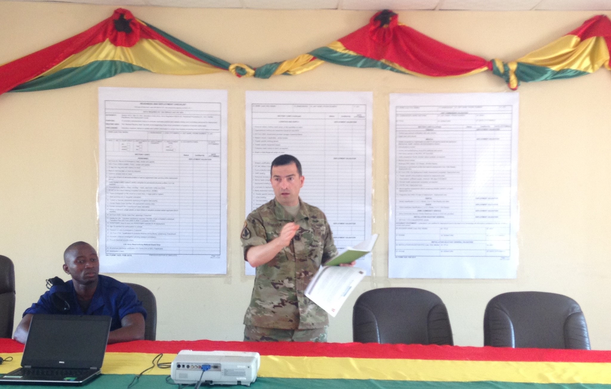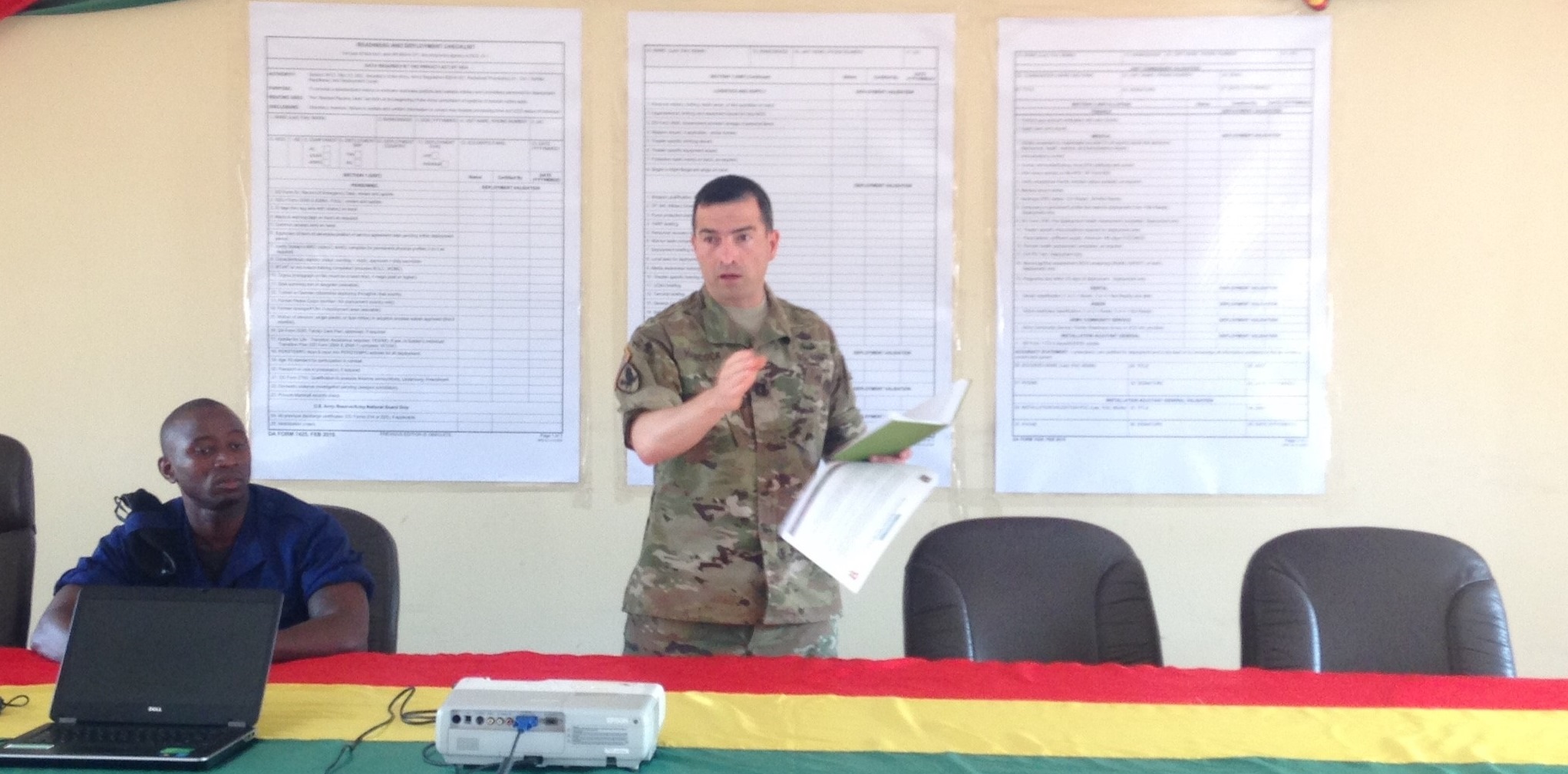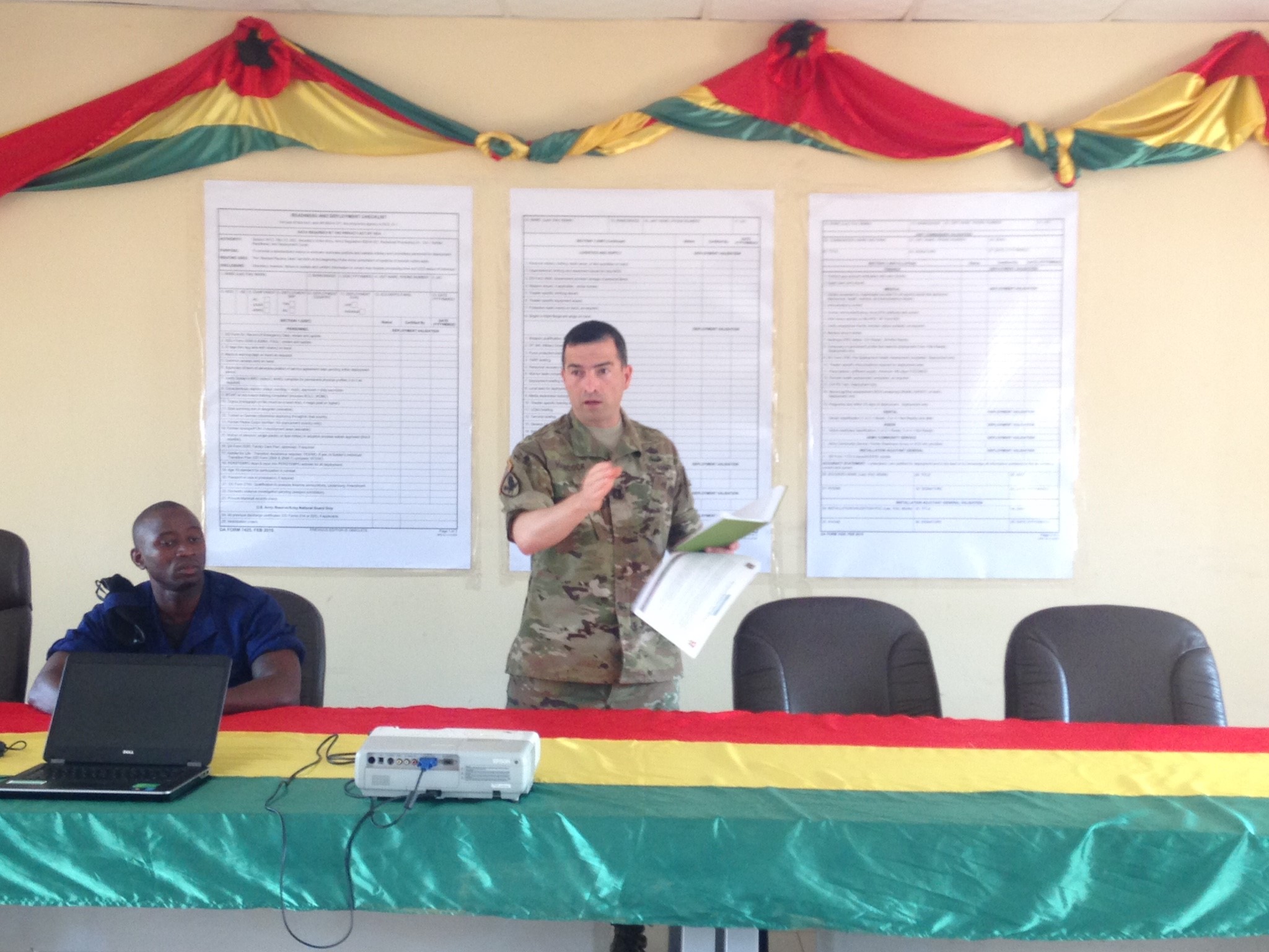 Capt. Wayne Hancock, U.S. Army Africa G1 operations officer, discusses readiness and deployment checklists with officers from the Armed Forces of Guinea-Bissau June 15, Bissau, Guinea-Bissau.