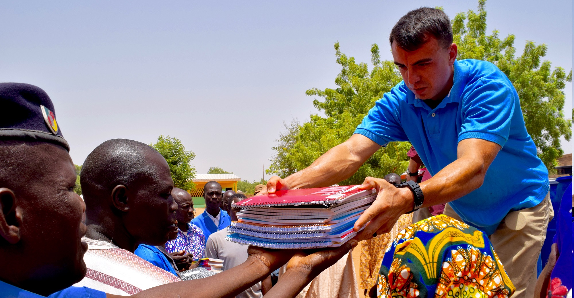 Sgt. 1st Class Sean Acosta, NCO in charge of Team 8321 from the 83rd Civil Affairs Battalion’s Bravo Company delivers supplies to a school in Garoua, Cameroon, April 21. The CA team, attached to the 101st Airborne Division-led Task Force Toccoa, partners with local Garoua leadership to strengthen the U.S./Cameroonian relationship.